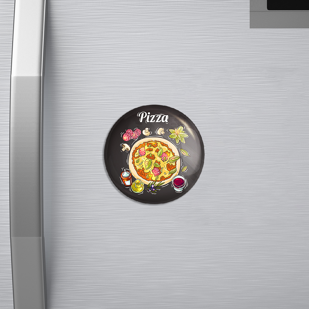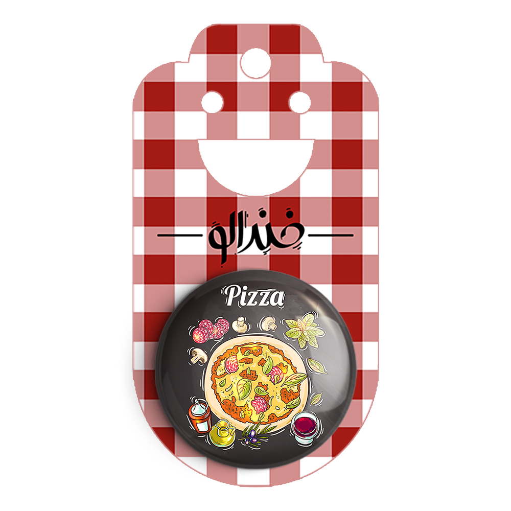 مگنت پیتزا Pizza خندالو با روکش سلفون مات مخملی ضدخش و قطعه پشتی فلزی تولید شده است که آهنربای اتمی بکار برده شده در محصول، بصورت مخفی تعبیه شده ودیده نمی شود. ضمن اینکه گیرایی بسیار بالایی داشته و به هیچ عنوان از روی یخچال نمی افتد.