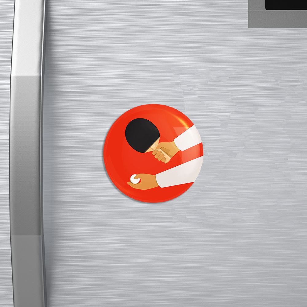 مگنت پینگ پنگ Ping Pong خندالو با روکش سلفون مات مخملی ضدخش و قطعه پشتی فلزی تولید شده است که آهنربای اتمی بکار برده شده در محصول، بصورت مخفی تعبیه شده ودیده نمی شود. ضمن اینکه گیرایی بسیار بالایی داشته و به هیچ عنوان از روی یخچال نمی افتد.