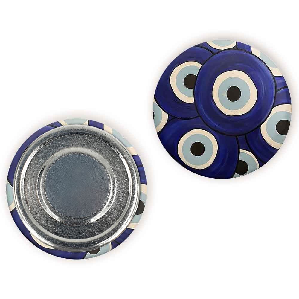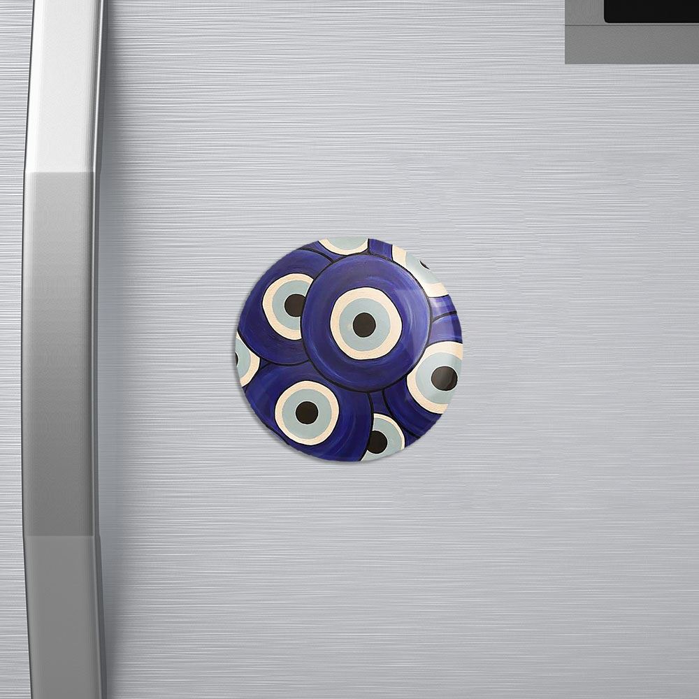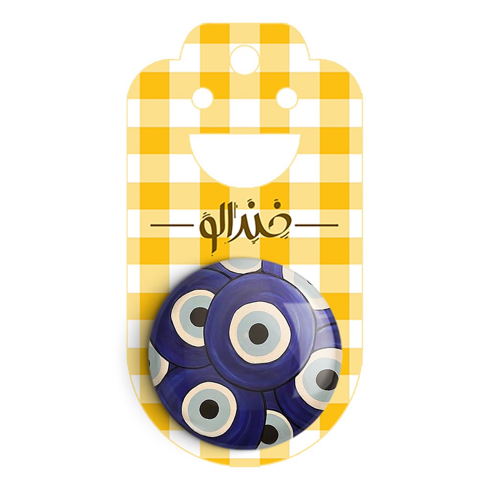 مگنت چشم نظر خندالو با روکش سلفون مات مخملی ضدخش و قطعه پشتی فلزی تولید شده است که آهنربای اتمی بکار برده شده در محصول، بصورت مخفی تعبیه شده ودیده نمی شود. ضمن اینکه گیرایی بسیار بالایی داشته و به هیچ عنوان از روی یخچال نمی افتد.