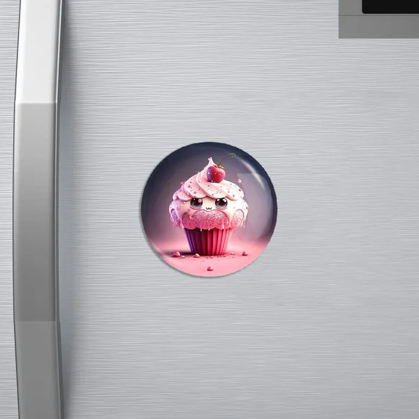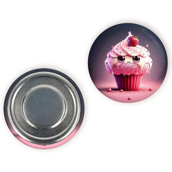 مگنت کاپ کیک خندالو با روکش سلفون مات مخملی ضدخش و قطعه پشتی فلزی تولید شده است که آهنربای اتمی بکار برده شده در محصول، بصورت مخفی تعبیه شده ودیده نمی شود. ضمن اینکه گیرایی بسیار بالایی داشته و به هیچ عنوان از روی یخچال نمی افتد.