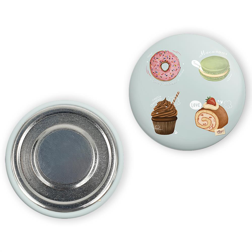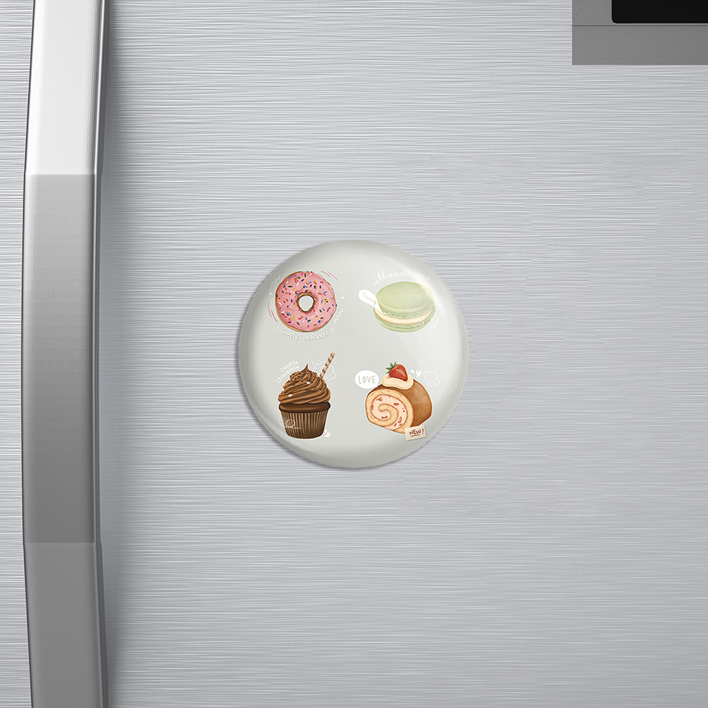 مگنت کیک و شیرینی پزی خندالو با روکش سلفون مات مخملی ضدخش و قطعه پشتی فلزی تولید شده است که آهنربای اتمی بکار برده شده در محصول، بصورت مخفی تعبیه شده ودیده نمی شود. ضمن اینکه گیرایی بسیار بالایی داشته و به هیچ عنوان از روی یخچال نمی افتد.