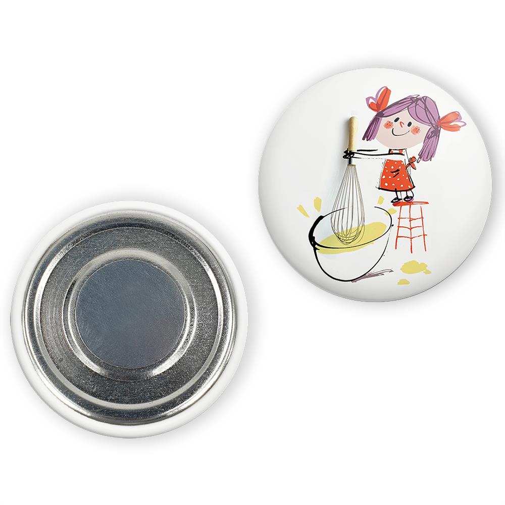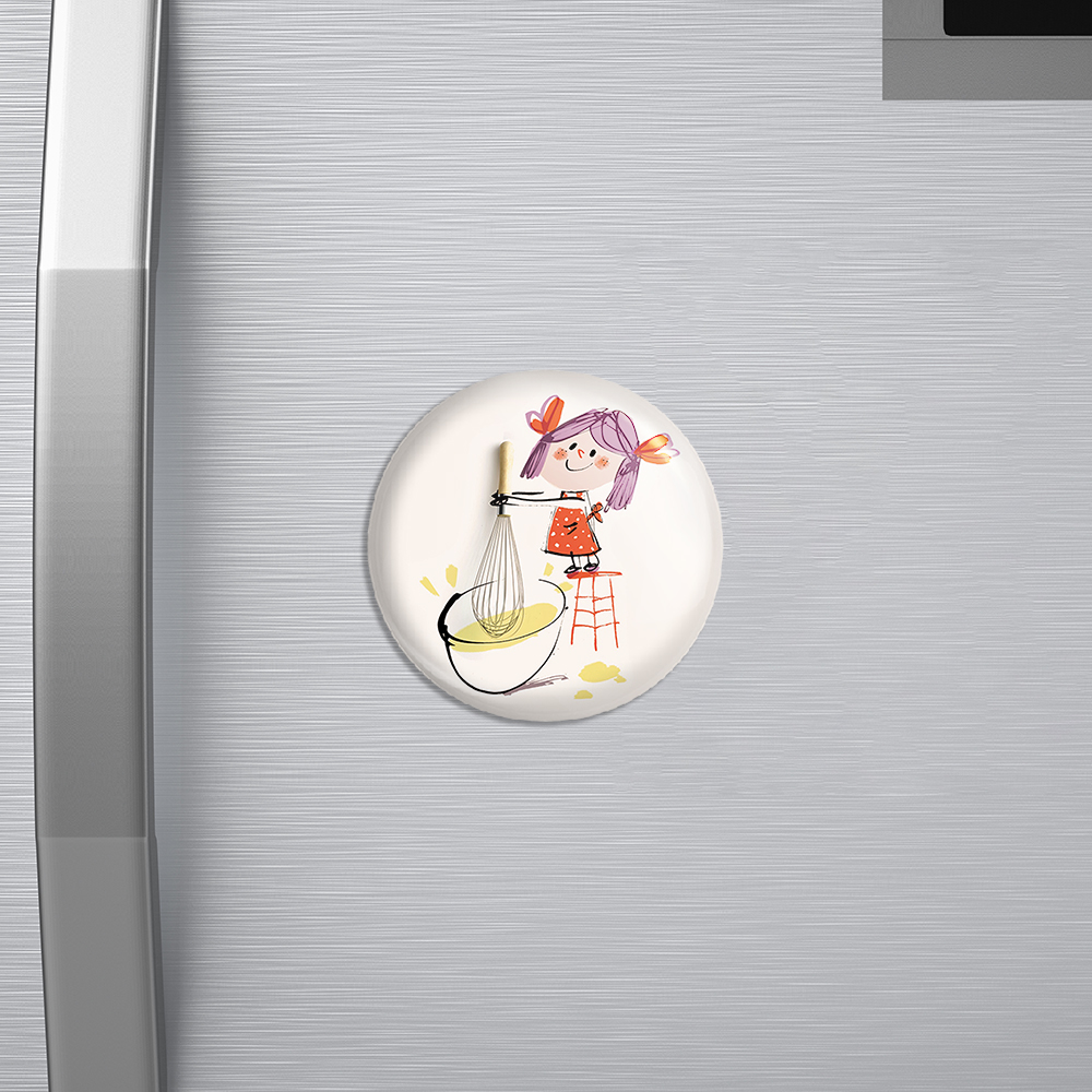 مگنت کیک و شیرینی پزی خندالو با روکش سلفون مات مخملی ضدخش و قطعه پشتی فلزی تولید شده است که آهنربای اتمی بکار برده شده در محصول، بصورت مخفی تعبیه شده ودیده نمی شود. ضمن اینکه گیرایی بسیار بالایی داشته و به هیچ عنوان از روی یخچال نمی افتد.