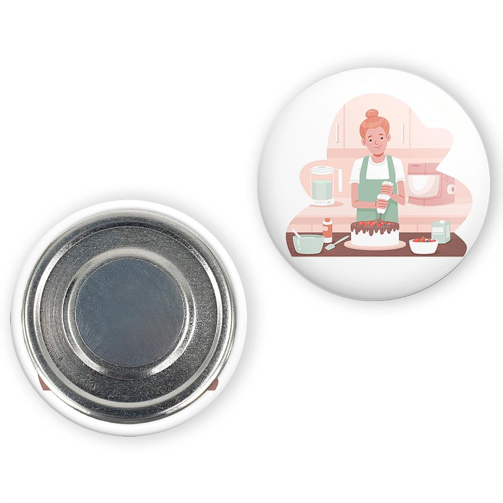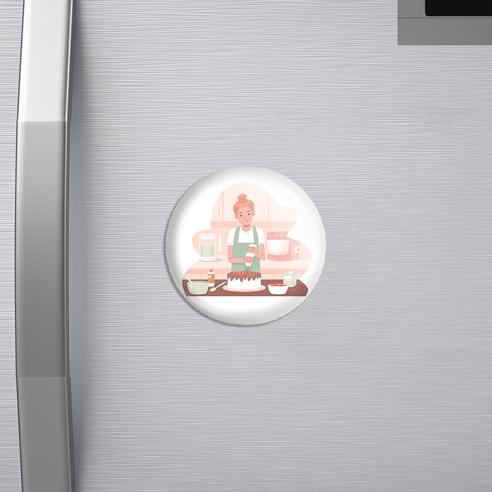 مگنت کیک و شیرینی پزی خندالو با روکش سلفون مات مخملی ضدخش و قطعه پشتی فلزی تولید شده است که آهنربای اتمی بکار برده شده در محصول، بصورت مخفی تعبیه شده ودیده نمی شود. ضمن اینکه گیرایی بسیار بالایی داشته و به هیچ عنوان از روی یخچال نمی افتد.