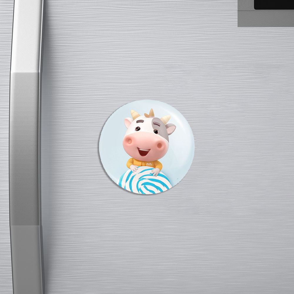 مگنت گاو خندالو با روکش سلفون مات مخملی ضدخش و قطعه پشتی فلزی تولید شده است که آهنربای اتمی بکار برده شده در محصول، بصورت مخفی تعبیه شده ودیده نمی شود. ضمن اینکه گیرایی بسیار بالایی داشته و به هیچ عنوان از روی یخچال نمی افتد.