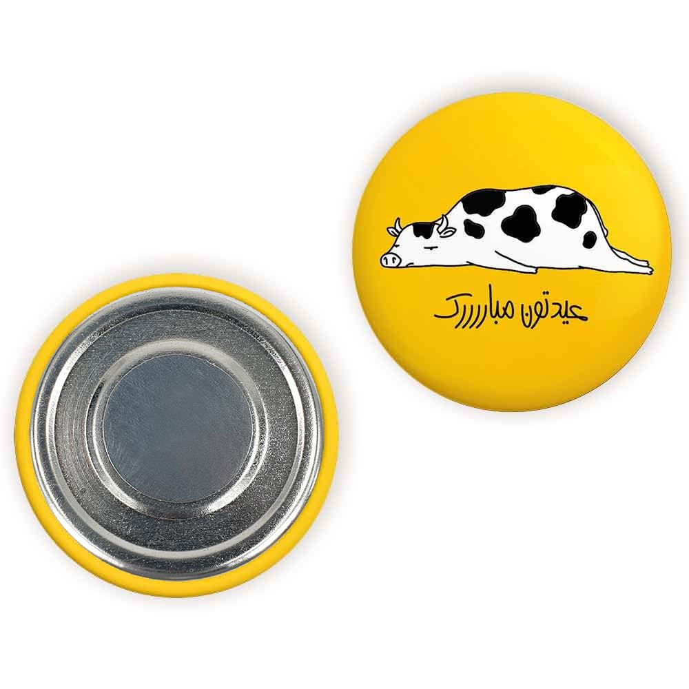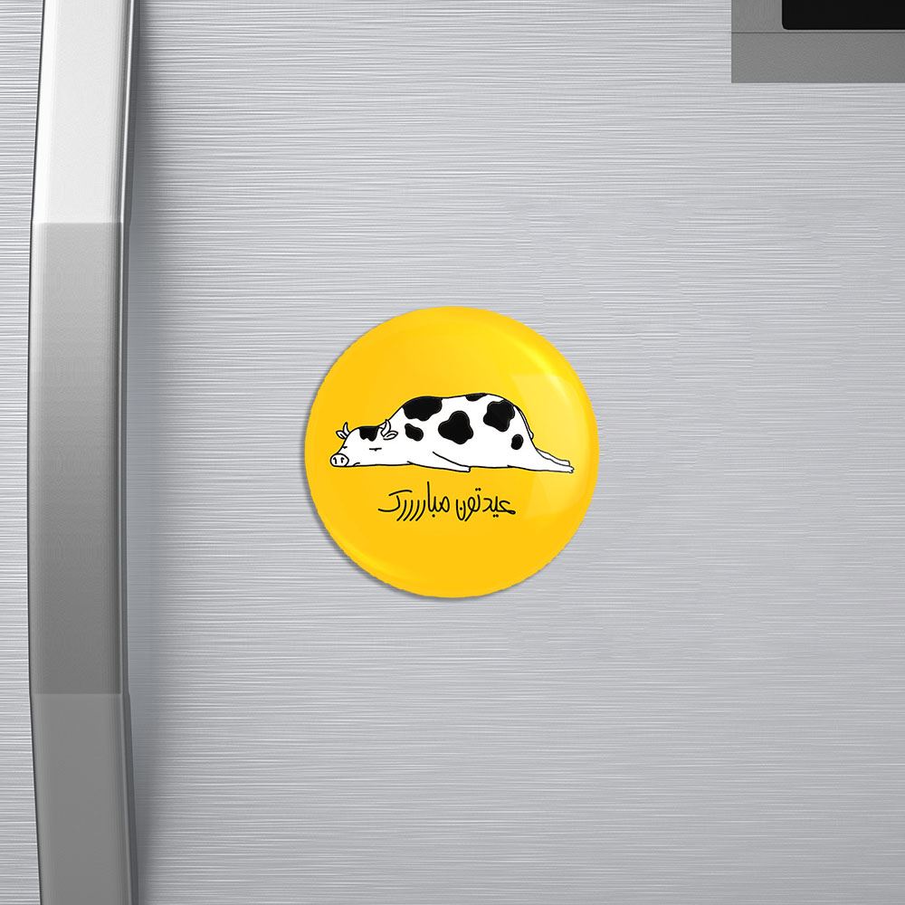 مگنت گاو خندالو با روکش سلفون مات مخملی ضدخش و قطعه پشتی فلزی تولید شده است که آهنربای اتمی بکار برده شده در محصول، بصورت مخفی تعبیه شده ودیده نمی شود. ضمن اینکه گیرایی بسیار بالایی داشته و به هیچ عنوان از روی یخچال نمی افتد.