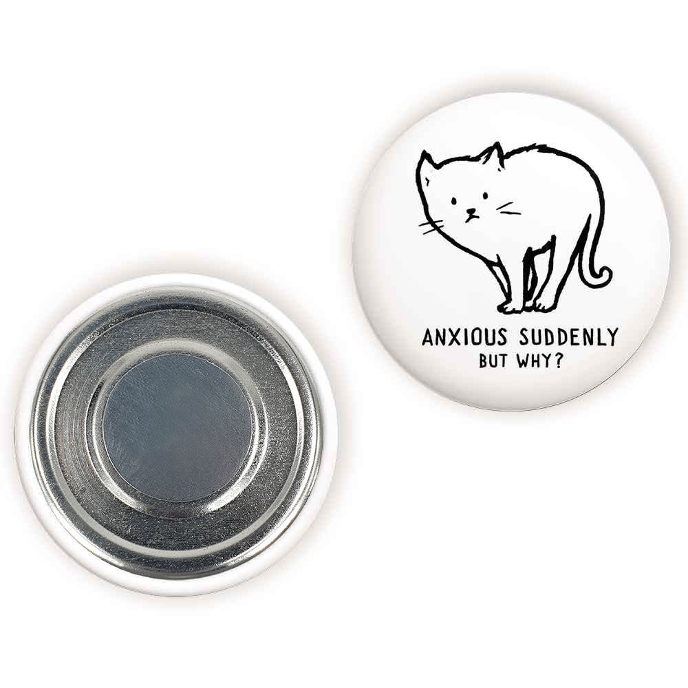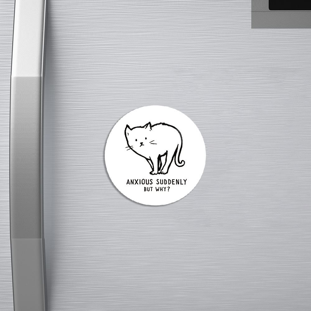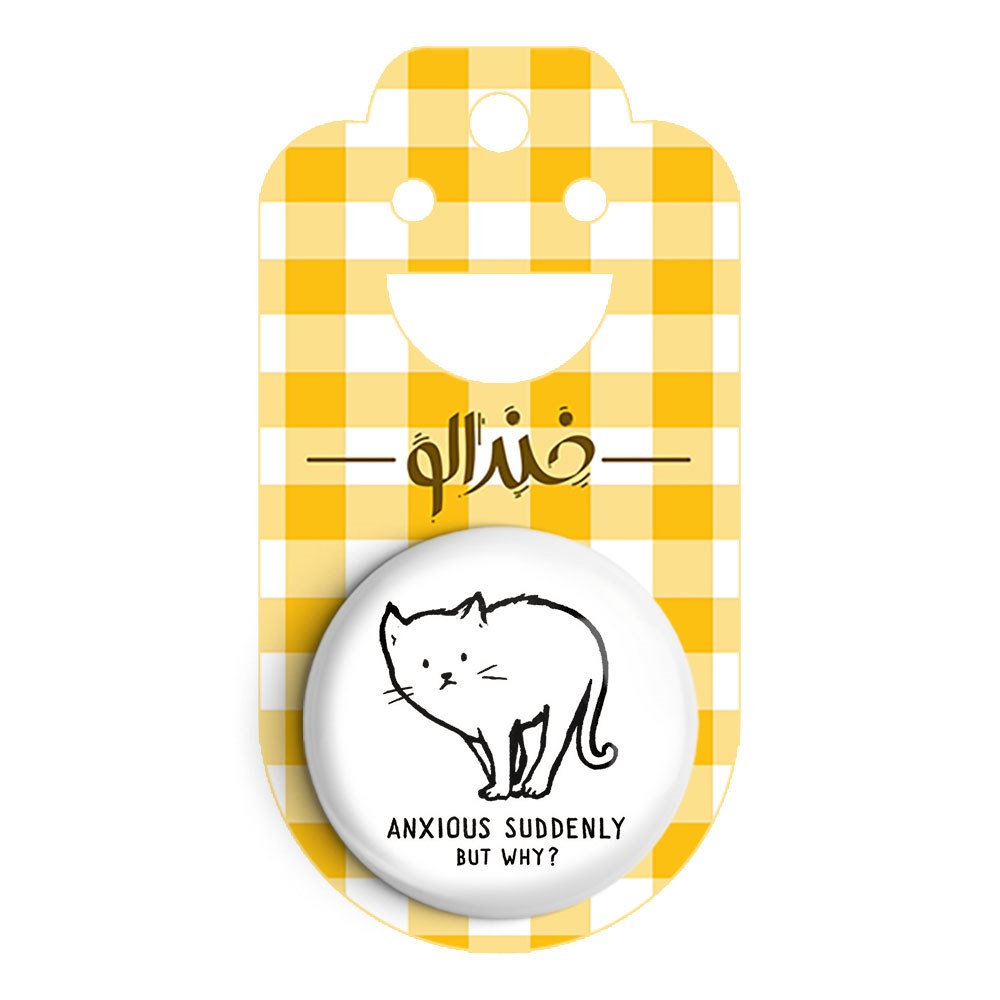 مگنت گربه مضطرب خندالو با روکش سلفون مات مخملی ضدخش و قطعه پشتی فلزی تولید شده است که آهنربای اتمی بکار برده شده در محصول، بصورت مخفی تعبیه شده ودیده نمی شود. ضمن اینکه گیرایی بسیار بالایی داشته و به هیچ عنوان از روی یخچال نمی افتد.