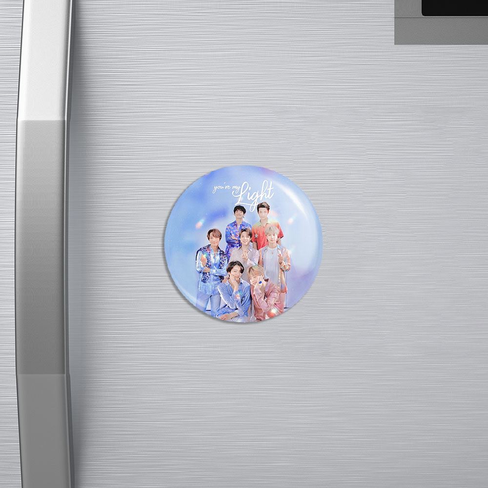 مگنت گروه بی تی اس BTS خندالو با روکش سلفون مات مخملی ضدخش و قطعه پشتی فلزی تولید شده است که آهنربای اتمی بکار برده شده در محصول، بصورت مخفی تعبیه شده ودیده نمی شود. ضمن اینکه گیرایی بسیار بالایی داشته و به هیچ عنوان از روی یخچال نمی افتد.