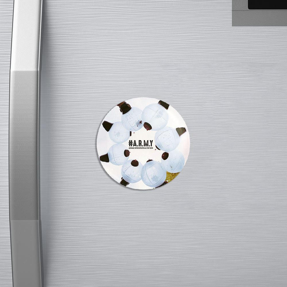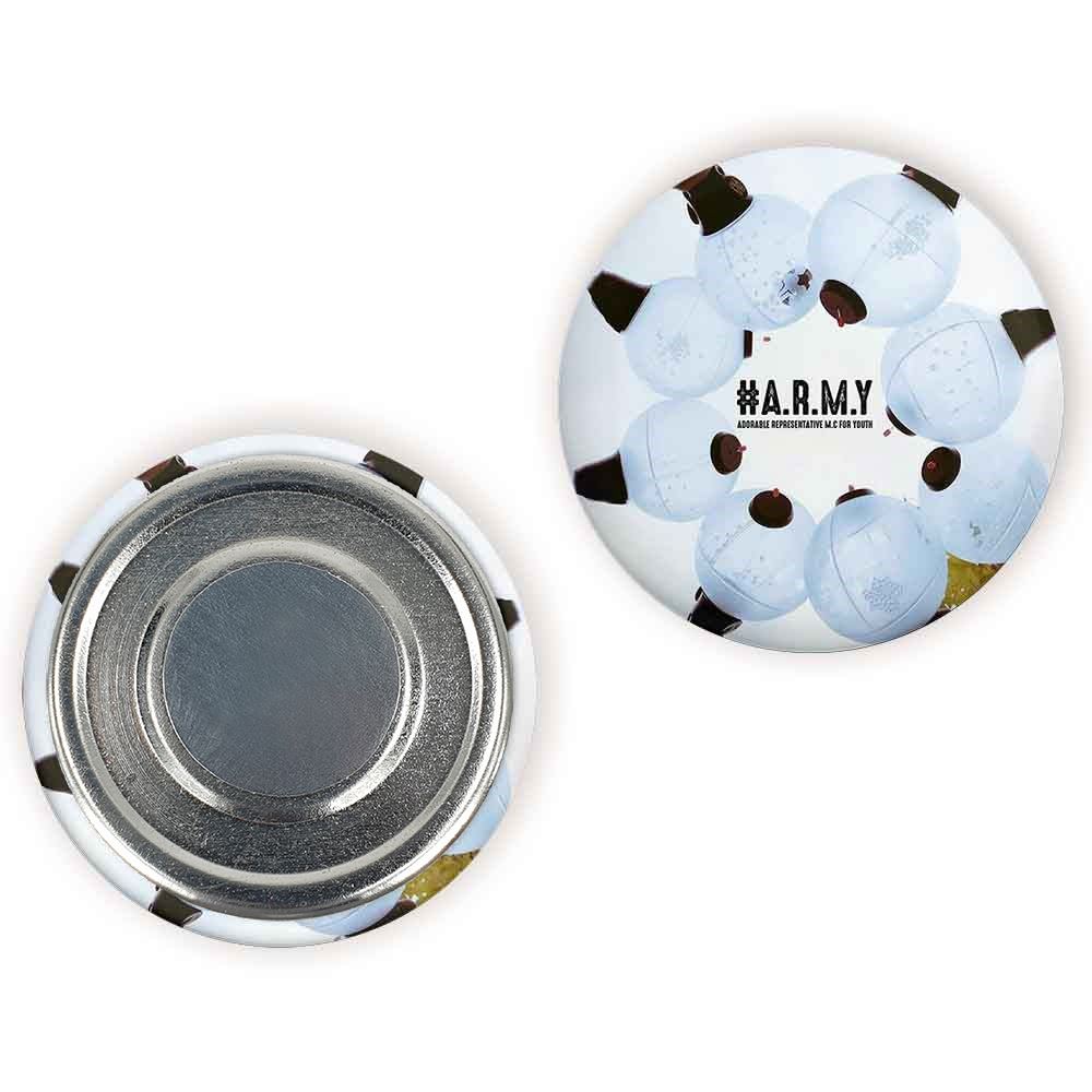 مگنت گروه بی تی اس BTS خندالو با روکش سلفون مات مخملی ضدخش و قطعه پشتی فلزی تولید شده است که آهنربای اتمی بکار برده شده در محصول، بصورت مخفی تعبیه شده ودیده نمی شود. ضمن اینکه گیرایی بسیار بالایی داشته و به هیچ عنوان از روی یخچال نمی افتد.