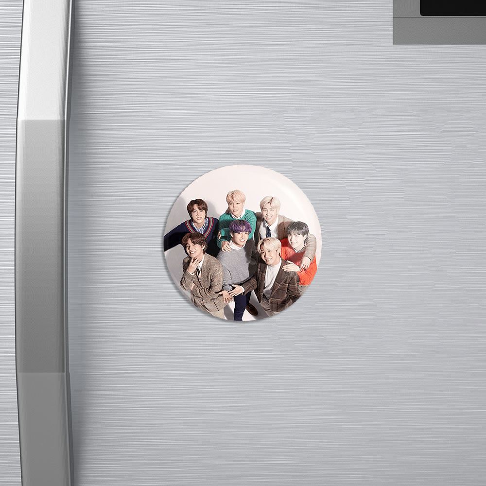 مگنت گروه بی تی اس BTS خندالو با روکش سلفون مات مخملی ضدخش و قطعه پشتی فلزی تولید شده است که آهنربای اتمی بکار برده شده در محصول، بصورت مخفی تعبیه شده ودیده نمی شود. ضمن اینکه گیرایی بسیار بالایی داشته و به هیچ عنوان از روی یخچال نمی افتد.