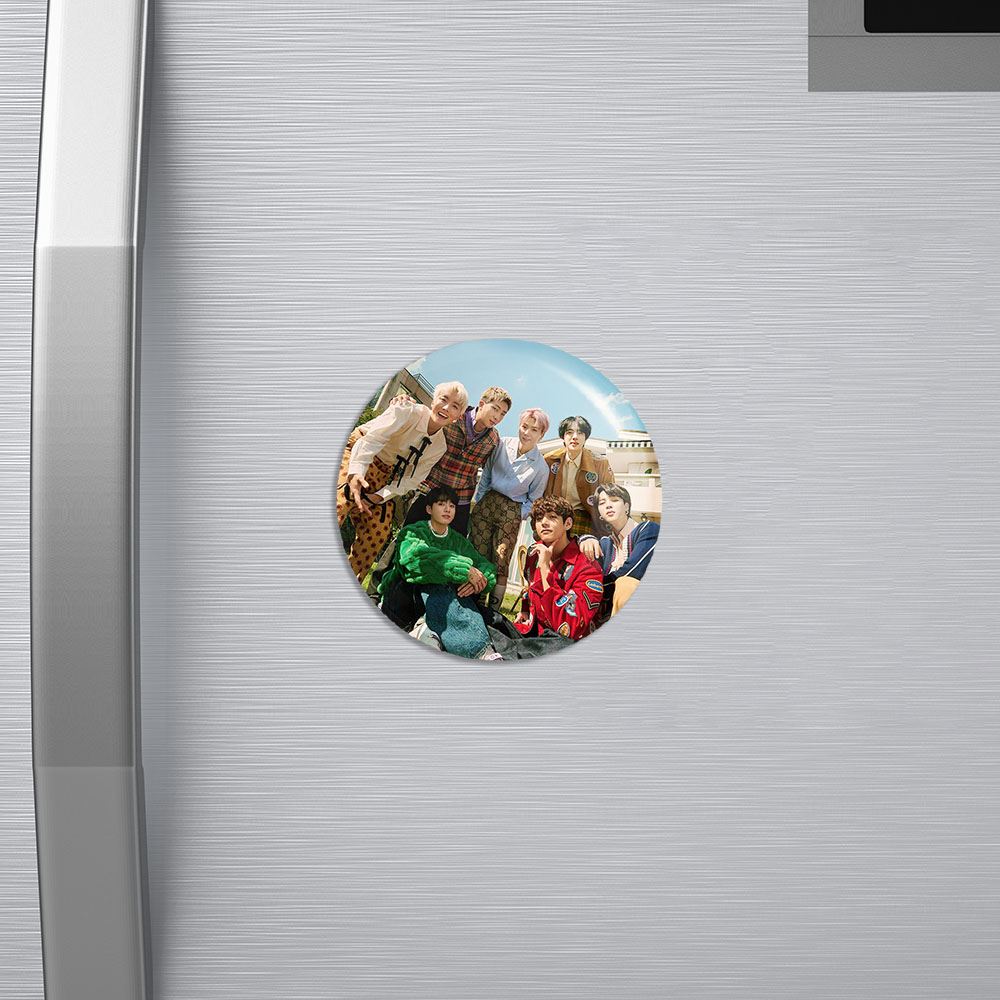 مگنت گروه بی تی اس BTS خندالو با روکش سلفون مات مخملی ضدخش و قطعه پشتی فلزی تولید شده است که آهنربای اتمی بکار برده شده در محصول، بصورت مخفی تعبیه شده ودیده نمی شود. ضمن اینکه گیرایی بسیار بالایی داشته و به هیچ عنوان از روی یخچال نمی افتد.