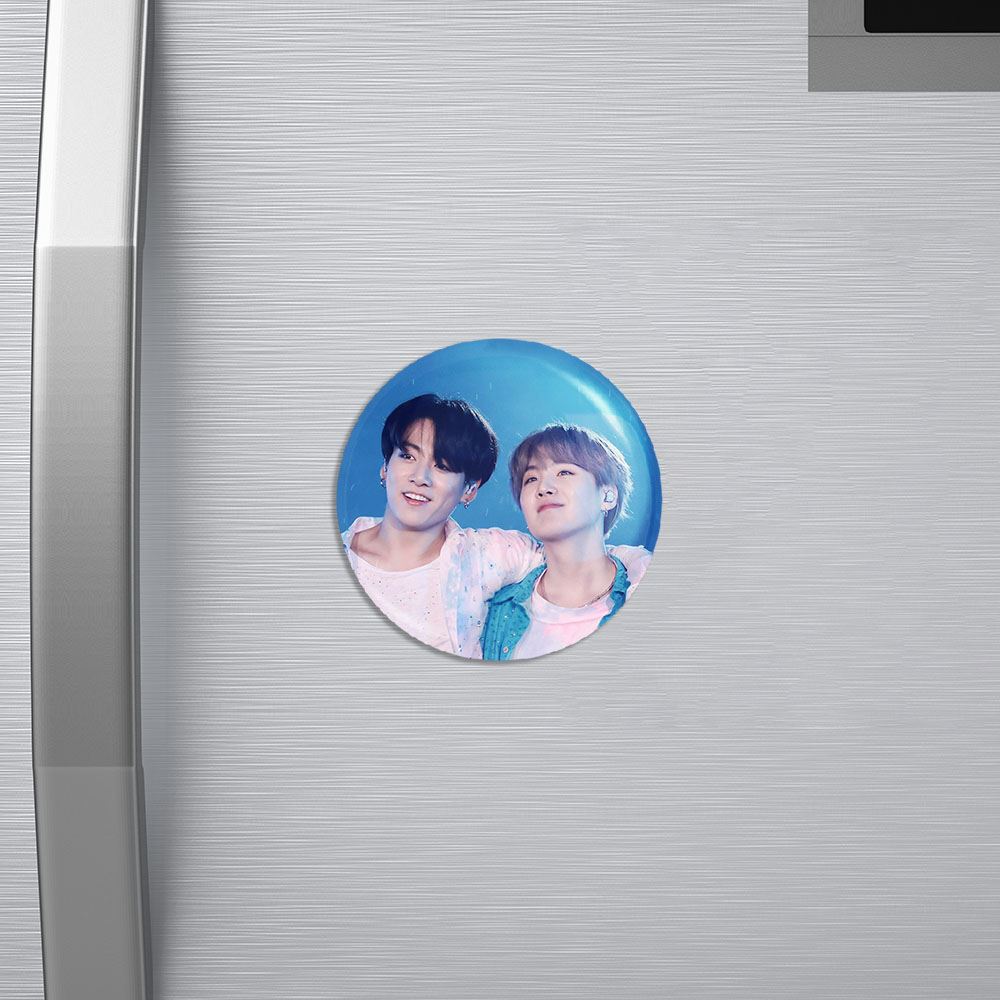 مگنت گروه بی تی اس BTS خندالو با روکش سلفون مات مخملی ضدخش و قطعه پشتی فلزی تولید شده است که آهنربای اتمی بکار برده شده در محصول، بصورت مخفی تعبیه شده ودیده نمی شود. ضمن اینکه گیرایی بسیار بالایی داشته و به هیچ عنوان از روی یخچال نمی افتد.