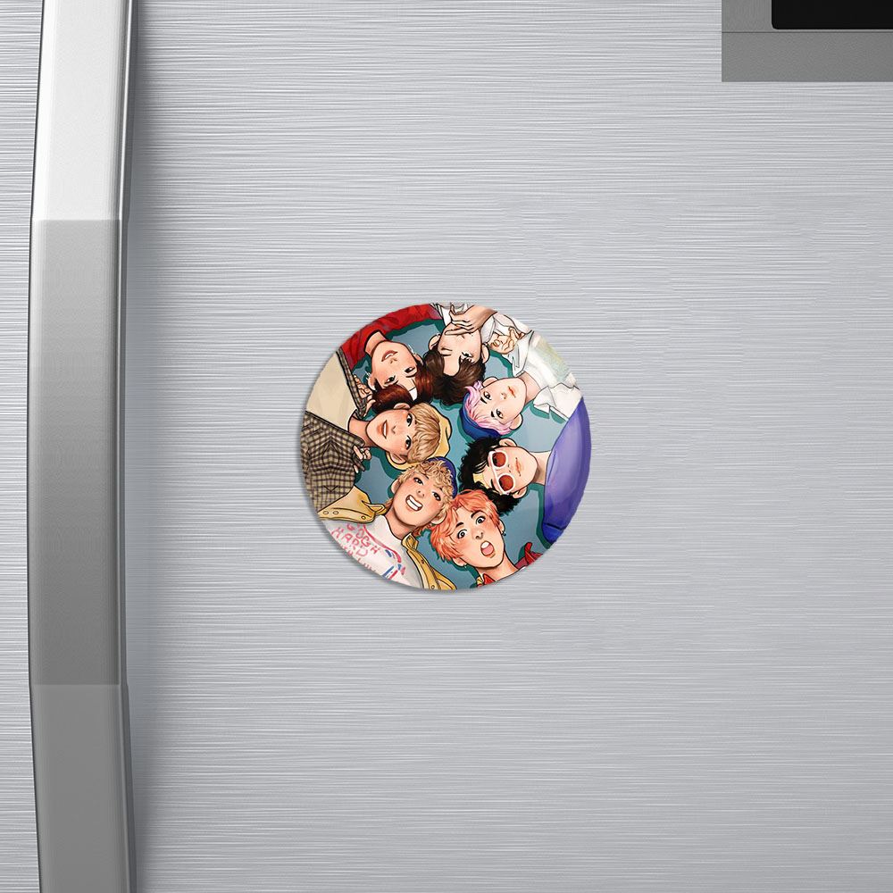 مگنت گروه بی تی اس BTS خندالو با روکش سلفون مات مخملی ضدخش و قطعه پشتی فلزی تولید شده است که آهنربای اتمی بکار برده شده در محصول، بصورت مخفی تعبیه شده ودیده نمی شود. ضمن اینکه گیرایی بسیار بالایی داشته و به هیچ عنوان از روی یخچال نمی افتد.