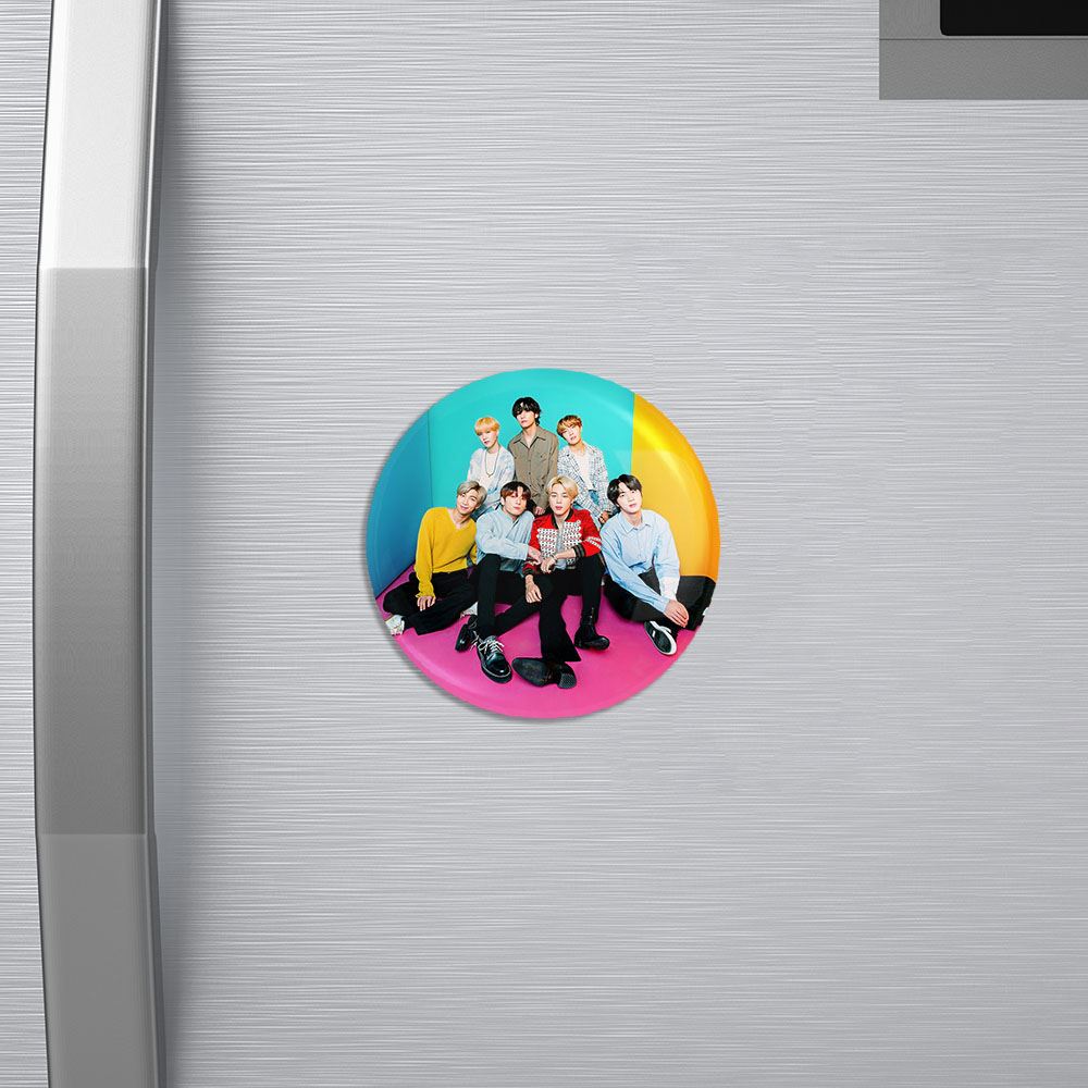 مگنت گروه بی تی اس BTS خندالو با روکش سلفون مات مخملی ضدخش و قطعه پشتی فلزی تولید شده است که آهنربای اتمی بکار برده شده در محصول، بصورت مخفی تعبیه شده ودیده نمی شود. ضمن اینکه گیرایی بسیار بالایی داشته و به هیچ عنوان از روی یخچال نمی افتد.