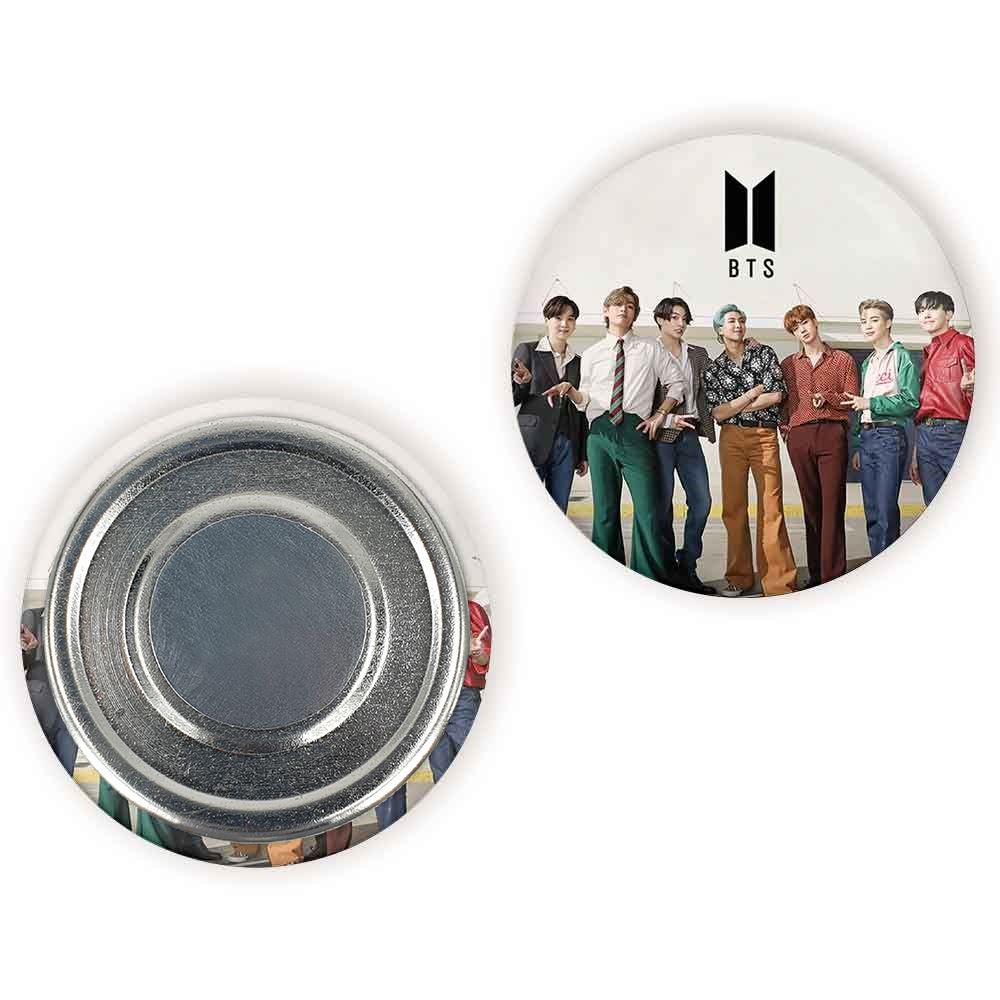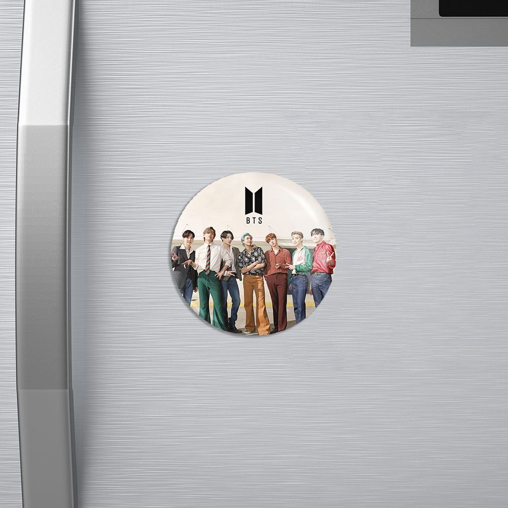 مگنت گروه بی تی اس BTS خندالو با روکش سلفون مات مخملی ضدخش و قطعه پشتی فلزی تولید شده است که آهنربای اتمی بکار برده شده در محصول، بصورت مخفی تعبیه شده ودیده نمی شود. ضمن اینکه گیرایی بسیار بالایی داشته و به هیچ عنوان از روی یخچال نمی افتد.