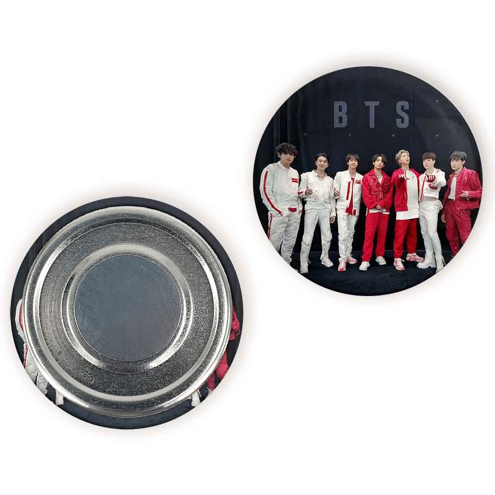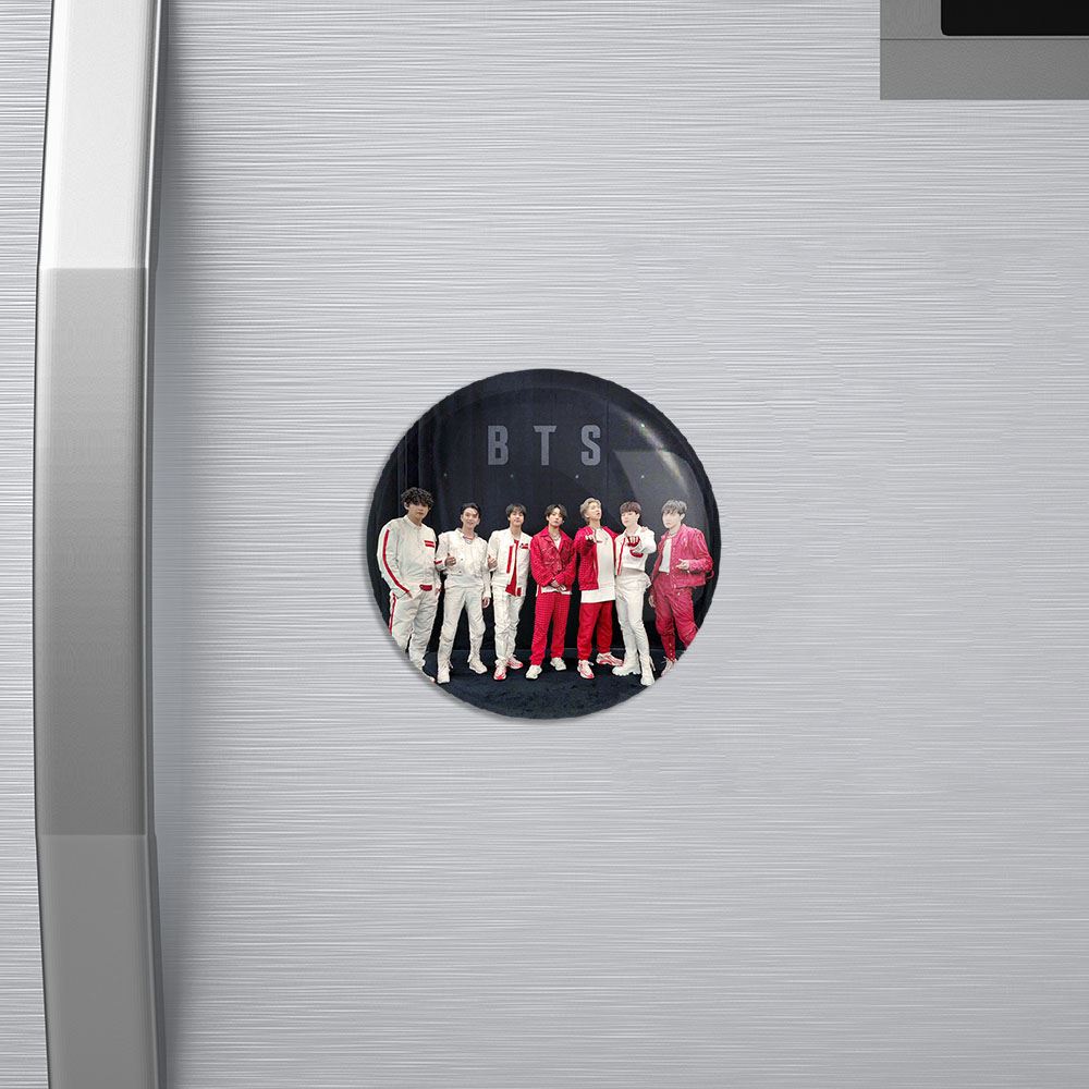 مگنت گروه بی تی اس BTS خندالو با روکش سلفون مات مخملی ضدخش و قطعه پشتی فلزی تولید شده است که آهنربای اتمی بکار برده شده در محصول، بصورت مخفی تعبیه شده ودیده نمی شود. ضمن اینکه گیرایی بسیار بالایی داشته و به هیچ عنوان از روی یخچال نمی افتد.
