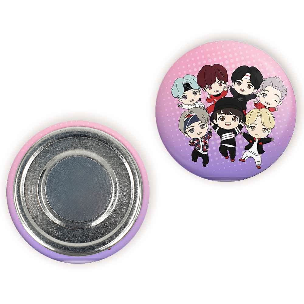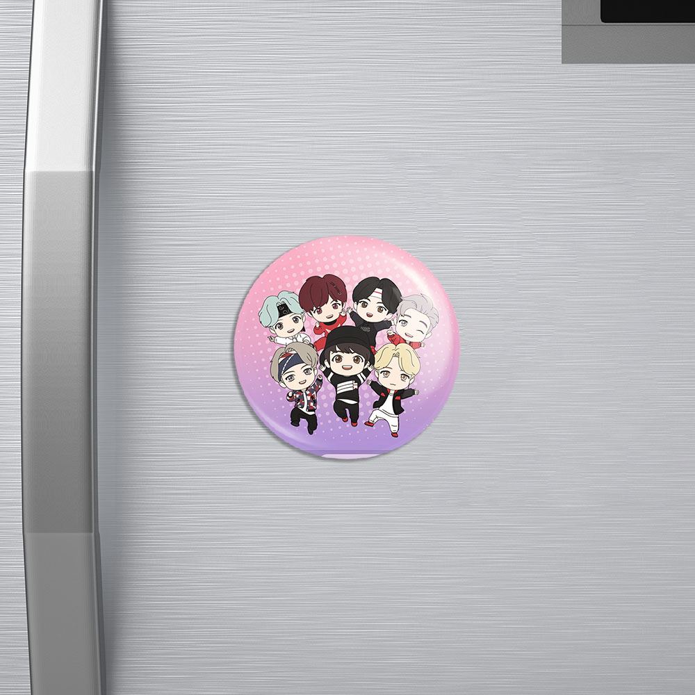 مگنت گروه بی تی اس BTS خندالو با روکش سلفون مات مخملی ضدخش و قطعه پشتی فلزی تولید شده است که آهنربای اتمی بکار برده شده در محصول، بصورت مخفی تعبیه شده ودیده نمی شود. ضمن اینکه گیرایی بسیار بالایی داشته و به هیچ عنوان از روی یخچال نمی افتد.