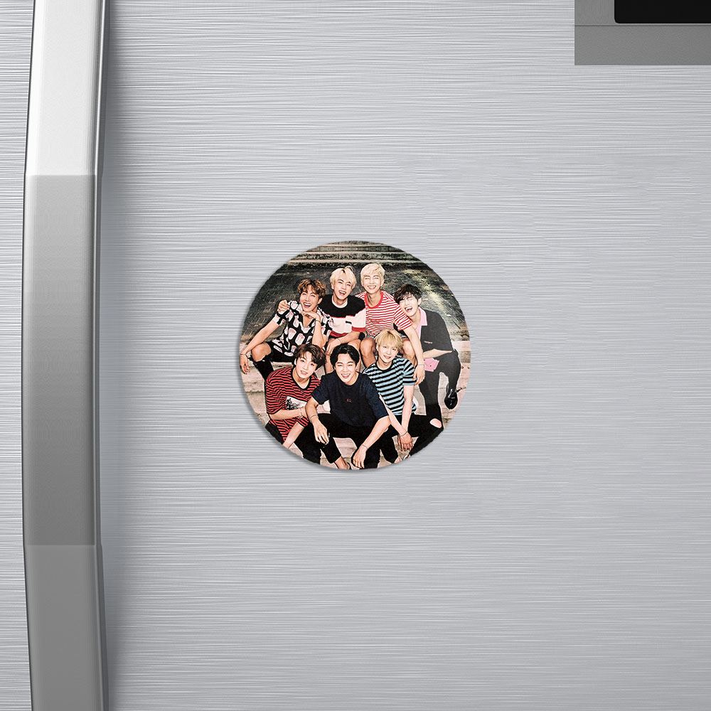 مگنت گروه بی تی اس BTS خندالو با روکش سلفون مات مخملی ضدخش و قطعه پشتی فلزی تولید شده است که آهنربای اتمی بکار برده شده در محصول، بصورت مخفی تعبیه شده ودیده نمی شود. ضمن اینکه گیرایی بسیار بالایی داشته و به هیچ عنوان از روی یخچال نمی افتد.