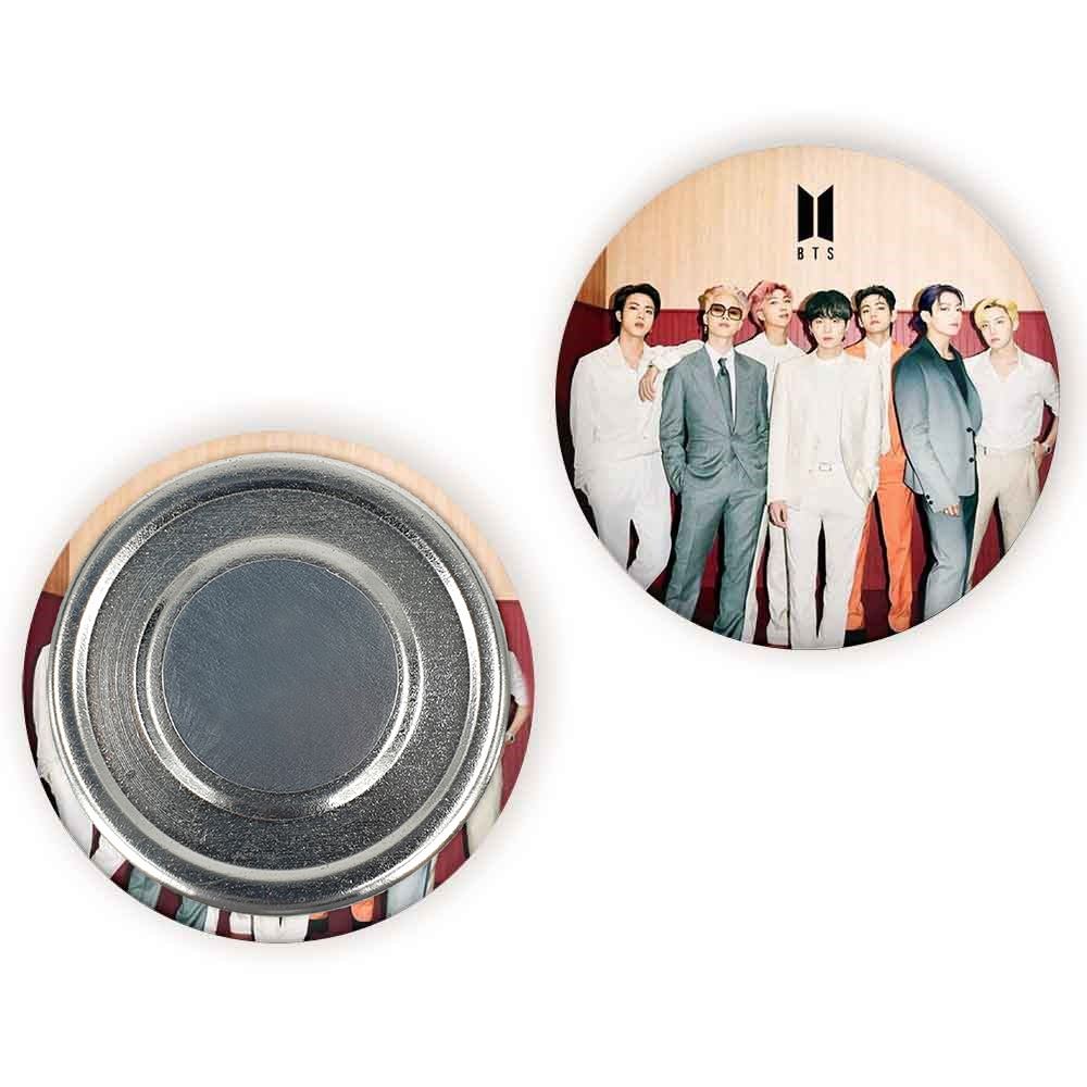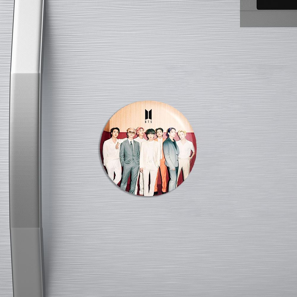 مگنت گروه بی تی اس BTS خندالو با روکش سلفون مات مخملی ضدخش و قطعه پشتی فلزی تولید شده است که آهنربای اتمی بکار برده شده در محصول، بصورت مخفی تعبیه شده ودیده نمی شود. ضمن اینکه گیرایی بسیار بالایی داشته و به هیچ عنوان از روی یخچال نمی افتد.