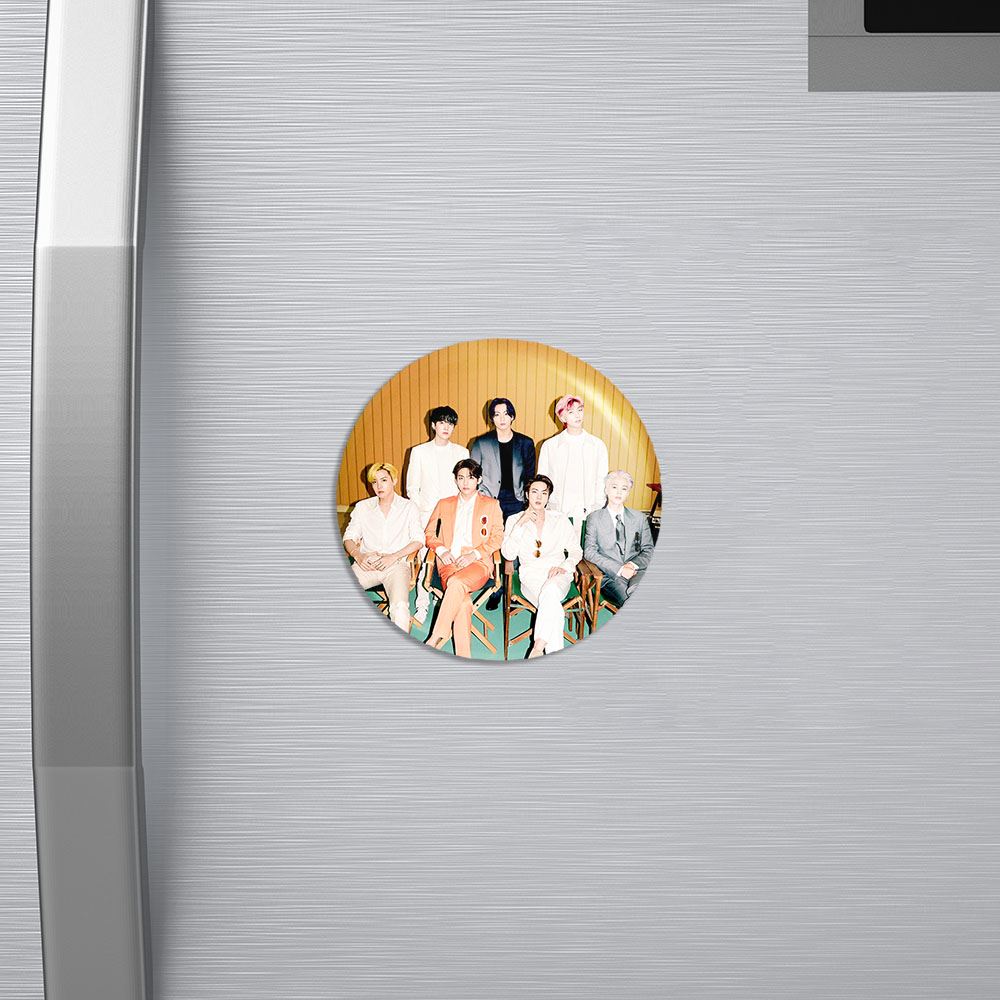 مگنت گروه بی تی اس BTS خندالو با روکش سلفون مات مخملی ضدخش و قطعه پشتی فلزی تولید شده است که آهنربای اتمی بکار برده شده در محصول، بصورت مخفی تعبیه شده ودیده نمی شود. ضمن اینکه گیرایی بسیار بالایی داشته و به هیچ عنوان از روی یخچال نمی افتد.
