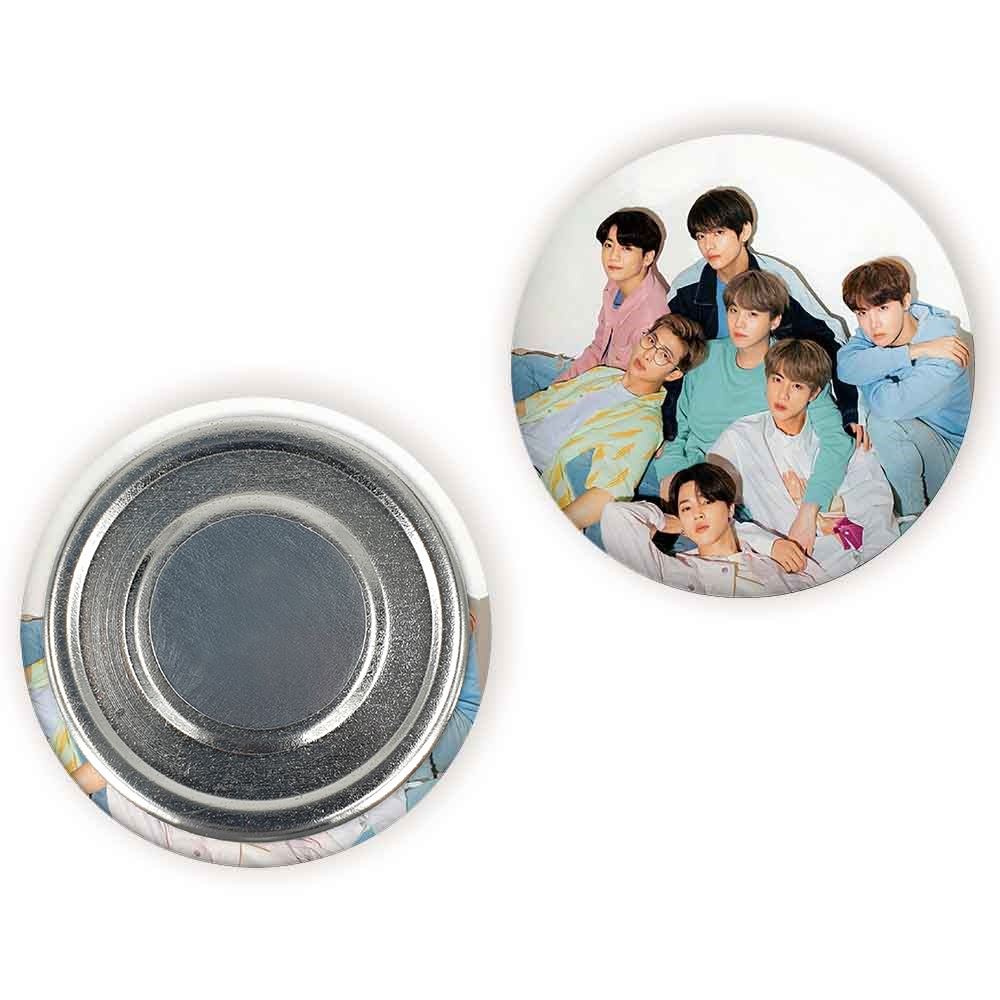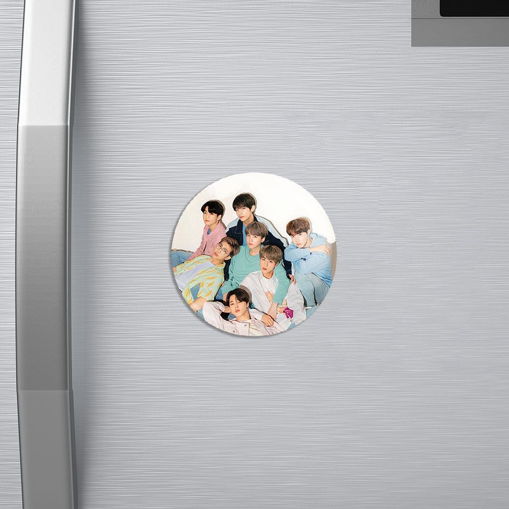 مگنت گروه بی تی اس BTS خندالو با روکش سلفون مات مخملی ضدخش و قطعه پشتی فلزی تولید شده است که آهنربای اتمی بکار برده شده در محصول، بصورت مخفی تعبیه شده ودیده نمی شود. ضمن اینکه گیرایی بسیار بالایی داشته و به هیچ عنوان از روی یخچال نمی افتد.