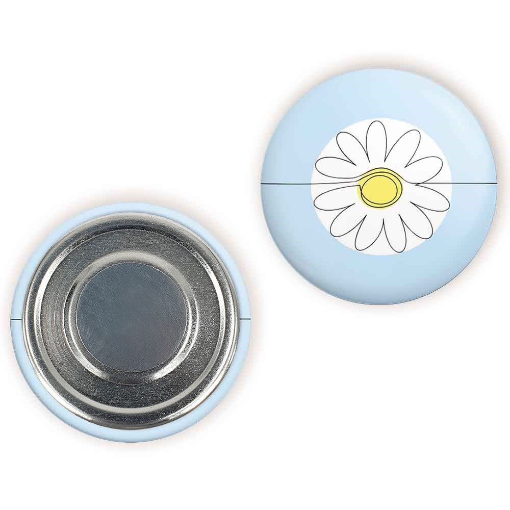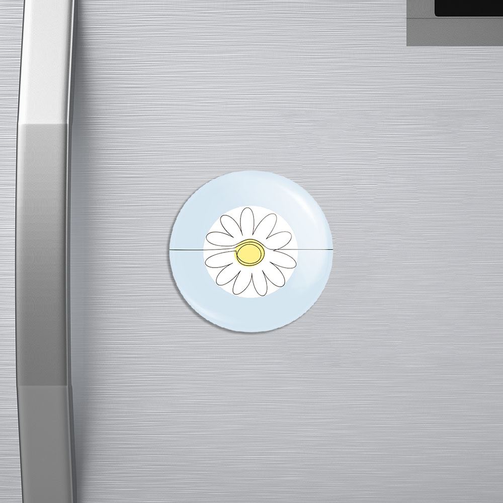 مگنت گل بابونه خندالو با روکش سلفون مات مخملی ضدخش و قطعه پشتی فلزی تولید شده است که آهنربای اتمی بکار برده شده در محصول، بصورت مخفی تعبیه شده ودیده نمی شود. ضمن اینکه گیرایی بسیار بالایی داشته و به هیچ عنوان از روی یخچال نمی افتد.