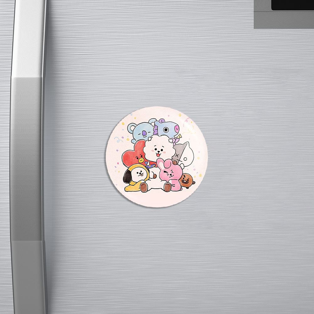 مگنت BT21 خندالو با روکش سلفون مات مخملی ضدخش و قطعه پشتی فلزی تولید شده است که آهنربای اتمی بکار برده شده در محصول، بصورت مخفی تعبیه شده ودیده نمی شود. ضمن اینکه گیرایی بسیار بالایی داشته و به هیچ عنوان از روی یخچال نمی افتد.