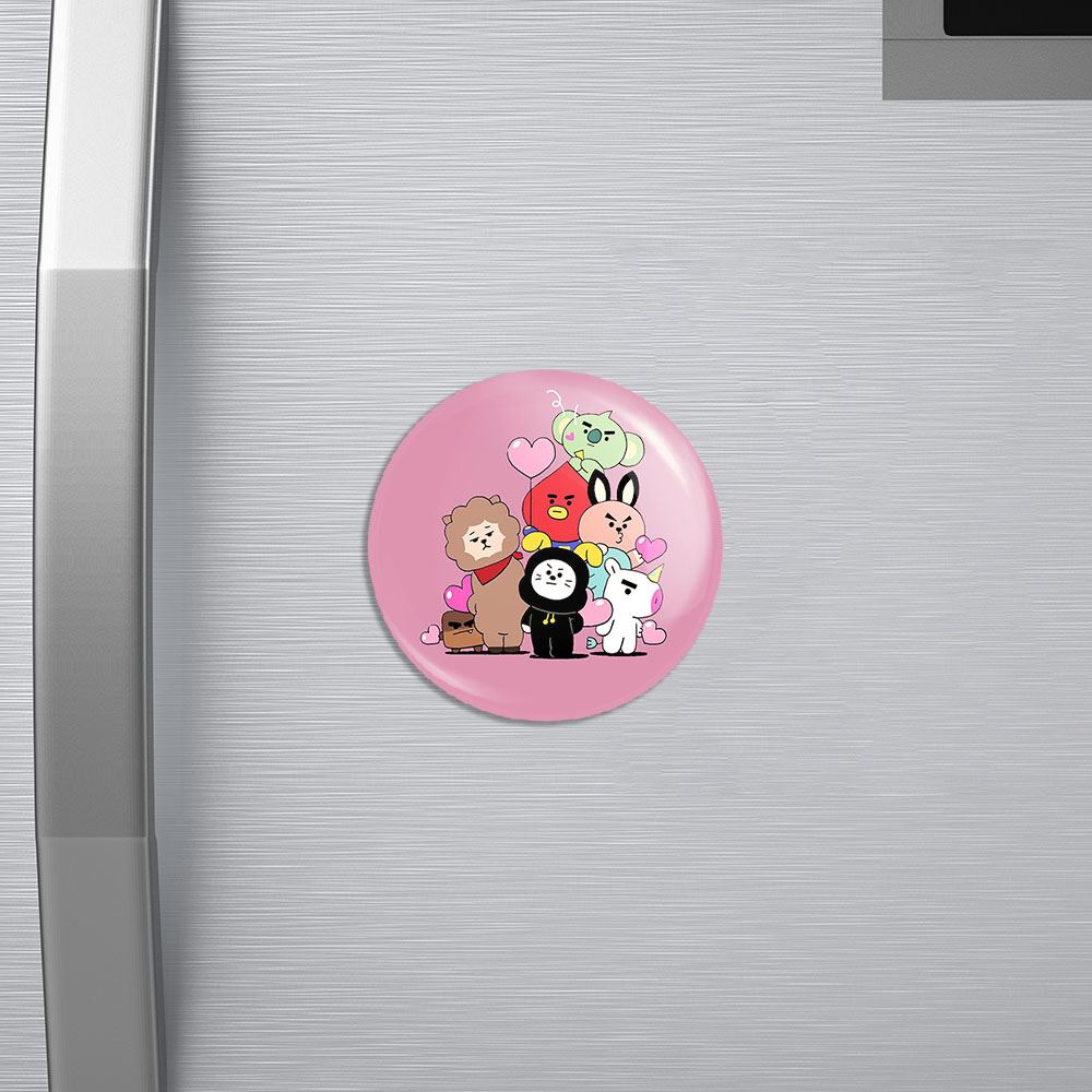 مگنت BT21 خندالو با روکش سلفون مات مخملی ضدخش و قطعه پشتی فلزی تولید شده است که آهنربای اتمی بکار برده شده در محصول، بصورت مخفی تعبیه شده ودیده نمی شود. ضمن اینکه گیرایی بسیار بالایی داشته و به هیچ عنوان از روی یخچال نمی افتد.