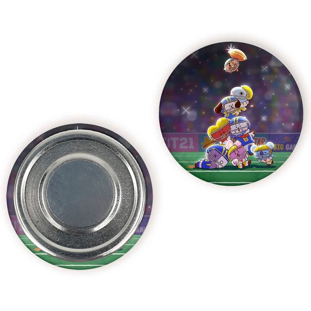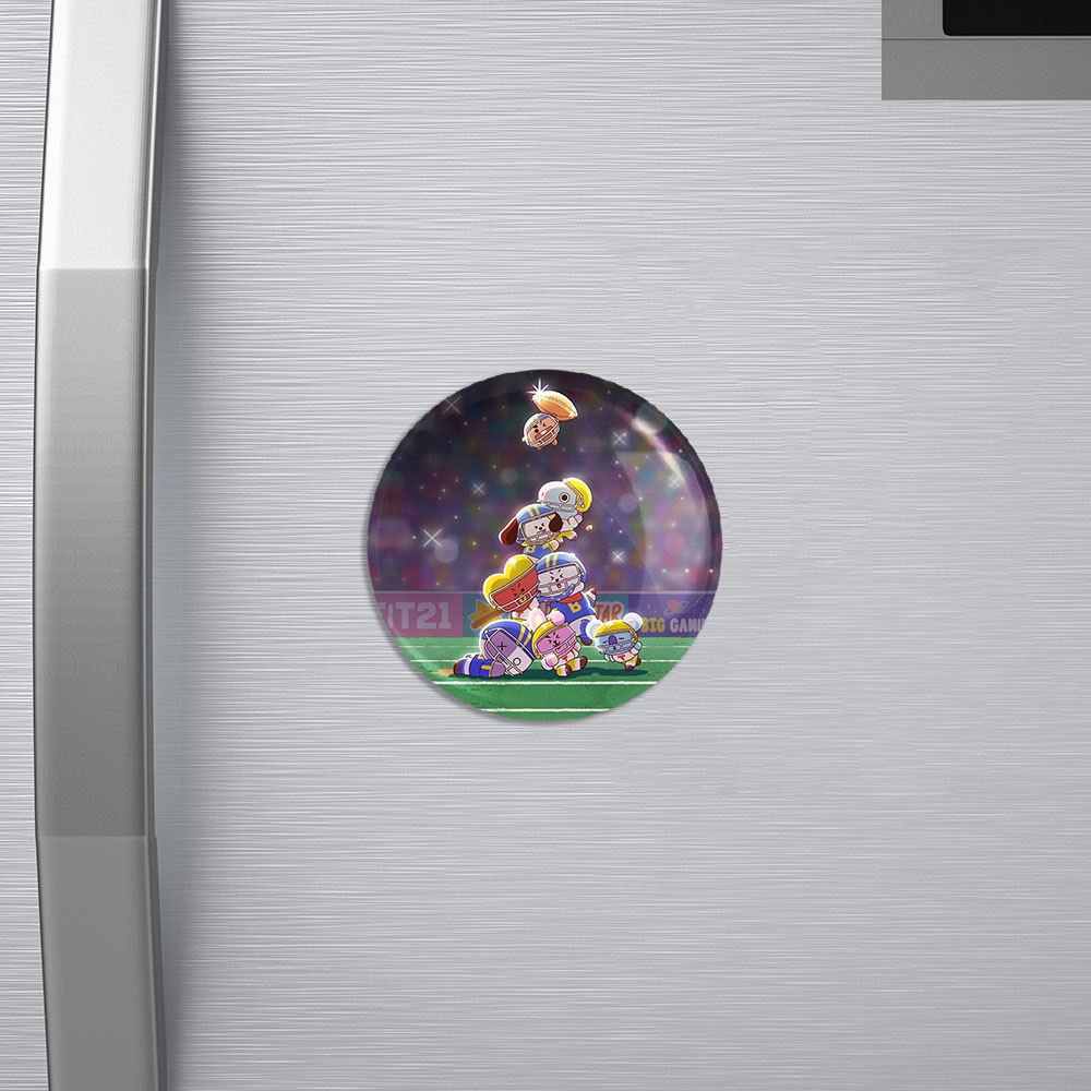 مگنت BT21 خندالو با روکش سلفون مات مخملی ضدخش و قطعه پشتی فلزی تولید شده است که آهنربای اتمی بکار برده شده در محصول، بصورت مخفی تعبیه شده ودیده نمی شود. ضمن اینکه گیرایی بسیار بالایی داشته و به هیچ عنوان از روی یخچال نمی افتد.