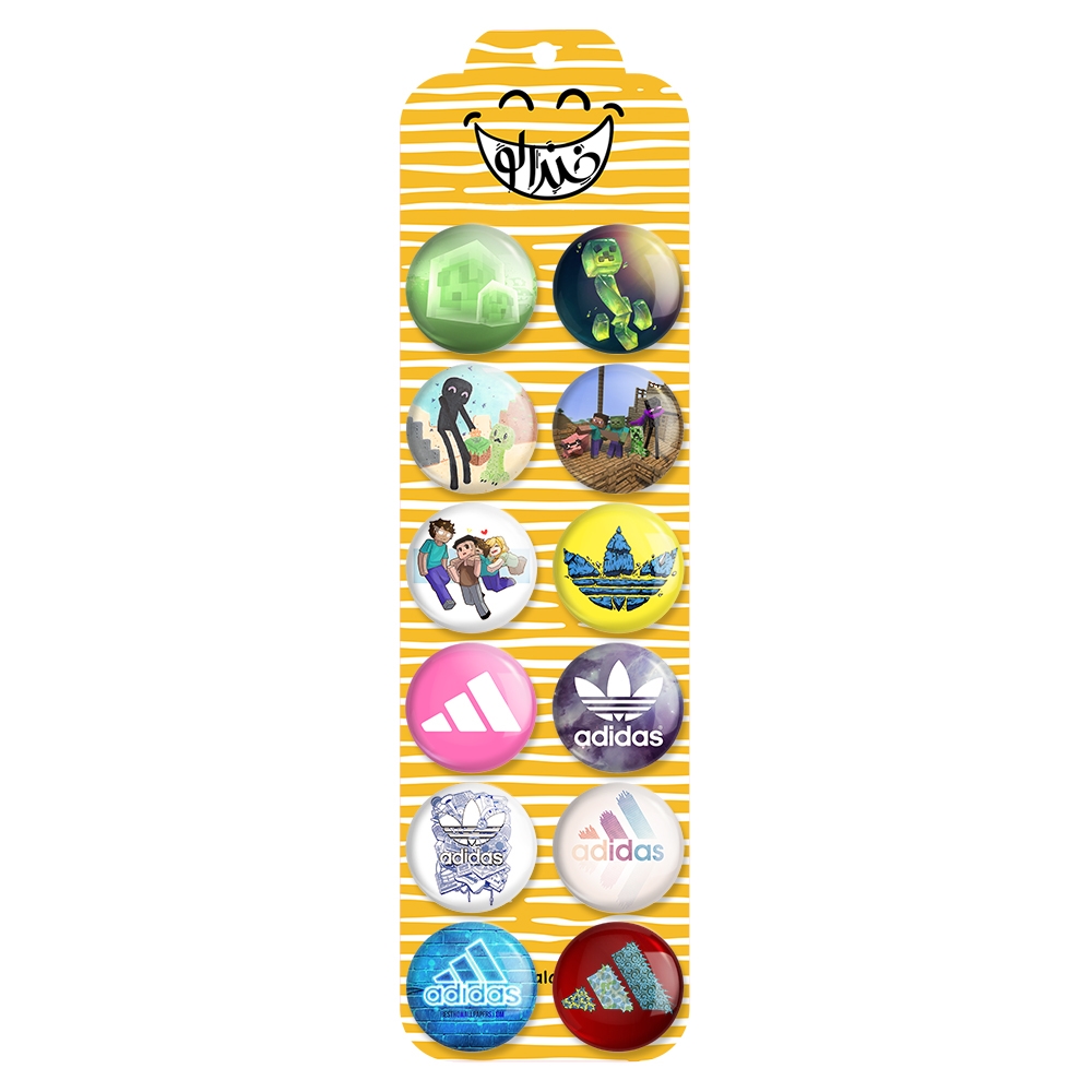 پک 12 عددی پیکسل خندالو طرح آدیداس (Adidas) با روکش سلفون حرارتی براق ضدخش و قطعه پشتی رنگی تولید شده است. قطعات پشتی از میان 6 رنگ سفید، مشکی، صورتی، زرد، آبی و قرمز که با توجه به نوع و رنگبندی طرح روی پیکسل انتخاب شده اند تولید می شود و در هر بسته بندی مطابق عکس محصول می باشد. قطعات پلاستیکی پشت پیکسل با سوزن یک تکه ثابت و بدون لغزش و جا به جایی، ایستایی بسیار بهتری نسبت به پشتی فلزی پیکسل دارند که این مهم در تولید این محصول نیز رعایت شده است.