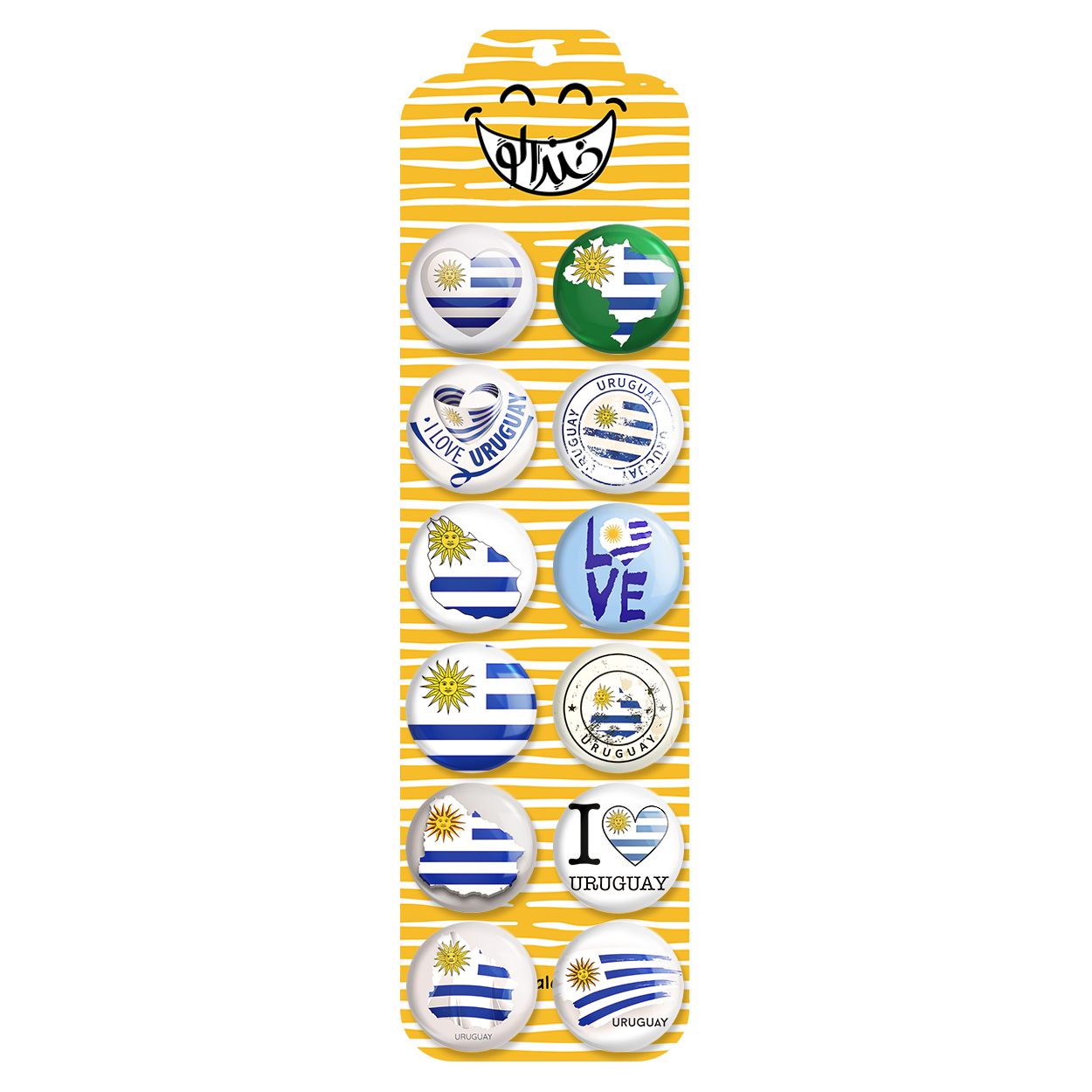 پک 12 عددی پیکسل خندالو طرح اروگوئه (Uruguay) با روکش سلفون حرارتی براق ضدخش و قطعه پشتی رنگی تولید شده است. قطعات پشتی از میان 6 رنگ سفید، مشکی، صورتی، زرد، آبی و قرمز که با توجه به نوع و رنگبندی طرح روی پیکسل انتخاب شده اند تولید می شود و در هر بسته بندی مطابق عکس محصول می باشد. قطعات پلاستیکی پشت پیکسل با سوزن یک تکه ثابت و بدون لغزش و جا به جایی، ایستایی بسیار بهتری نسبت به پشتی فلزی پیکسل دارند که این مهم در تولید این محصول نیز رعایت شده است. چاپ پیکسل طرح اروگوئه (Uruguay) بسته ۱۲ عددی نیز با دستگاه های استاندارد و با بهترین سطح کیفی صورت گرفته و طرح با شفافیتی مثال زدنی و با سلفونی بدون شکست نور بر روی پیکسل نقش بسته است.