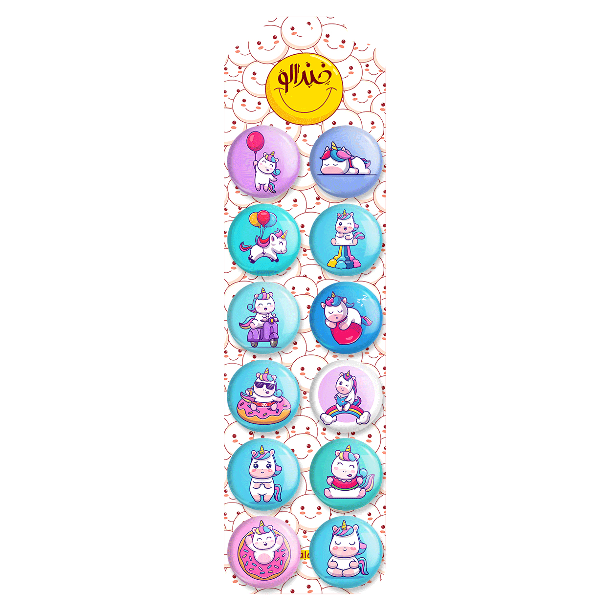 پک 12 عددی پیکسل خندالو طرح اسب تک شاخ (Unicorn) با روکش سلفون حرارتی براق ضدخش و قطعه پشتی رنگی تولید شده است. قطعات پشتی از میان 6 رنگ سفید، مشکی، صورتی، زرد، آبی و قرمز که با توجه به نوع و رنگبندی طرح روی پیکسل انتخاب شده اند تولید می شود و در هر بسته بندی مطابق عکس محصول می باشد. قطعات پلاستیکی پشت پیکسل با سوزن یک تکه ثابت و بدون لغزش و جا به جایی، ایستایی بسیار بهتری نسبت به پشتی فلزی پیکسل دارند که این مهم در تولید این محصول نیز رعایت شده است. چاپ پیکسل طرح اسب تک شاخ (Unicorn) بسته ۱۲ عددی نیز با دستگاه های استاندارد و با بهترین سطح کیفی صورت گرفته و طرح با شفافیتی مثال زدنی و با سلفونی بدون شکست نور بر روی پیکسل نقش بسته است.