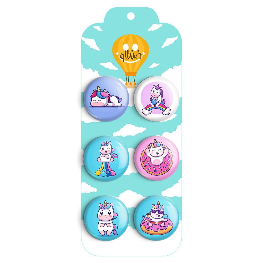 مجموعه 6 عددی پیکسل خندالو طرح اسب تک شاخ (Unicorn) با روکش سلفون حرارتی براق ضدخش و قطعه پشتی رنگی تولید شده است. قطعات پشتی از میان 6 رنگ سفید، مشکی، صورتی، زرد، آبی و قرمز که با توجه به نوع و رنگبندی طرح روی پیکسل انتخاب شده اند تولید می شود و در هر بسته بندی مطابق عکس محصول می باشد. قطعات پلاستیکی پشت پیکسل با سوزن یک تکه ثابت و بدون لغزش و جا به جایی، ایستایی بسیار بهتری نسبت به پشتی فلزی پیکسل دارند که این مهم در تولید این محصول نیز رعایت شده است. چاپ پیکسل نیز با دستگاه های استاندارد و با بهترین سطح کیفی صورت گرفته و طرح با شفافیتی مثال زدنی و با سلفونی بدون شکست نور بر روی پیکسل نقش بسته است. همچنین بسته بندی جذاب و مینیمال پیکسل ها، آنها را مناسب هدیه کرده است..