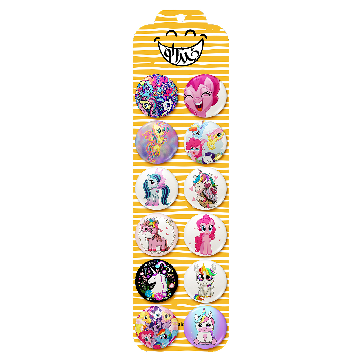 پک 12 عددی پیکسل خندالو طرح اسب تک شاخ (Unicorn) با روکش سلفون حرارتی براق ضدخش و قطعه پشتی رنگی تولید شده است. قطعات پشتی از میان 6 رنگ سفید، مشکی، صورتی، زرد، آبی و قرمز که با توجه به نوع و رنگبندی طرح روی پیکسل انتخاب شده اند تولید می شود و در هر بسته بندی مطابق عکس محصول می باشد. قطعات پلاستیکی پشت پیکسل با سوزن یک تکه ثابت و بدون لغزش و جا به جایی، ایستایی بسیار بهتری نسبت به پشتی فلزی پیکسل دارند که این مهم در تولید این محصول نیز رعایت شده است. چاپ پیکسل طرح اسب تک شاخ (Unicorn) بسته ۱۲ عددی نیز با دستگاه های استاندارد و با بهترین سطح کیفی صورت گرفته و طرح با شفافیتی مثال زدنی و با سلفونی بدون شکست نور بر روی پیکسل نقش بسته است.