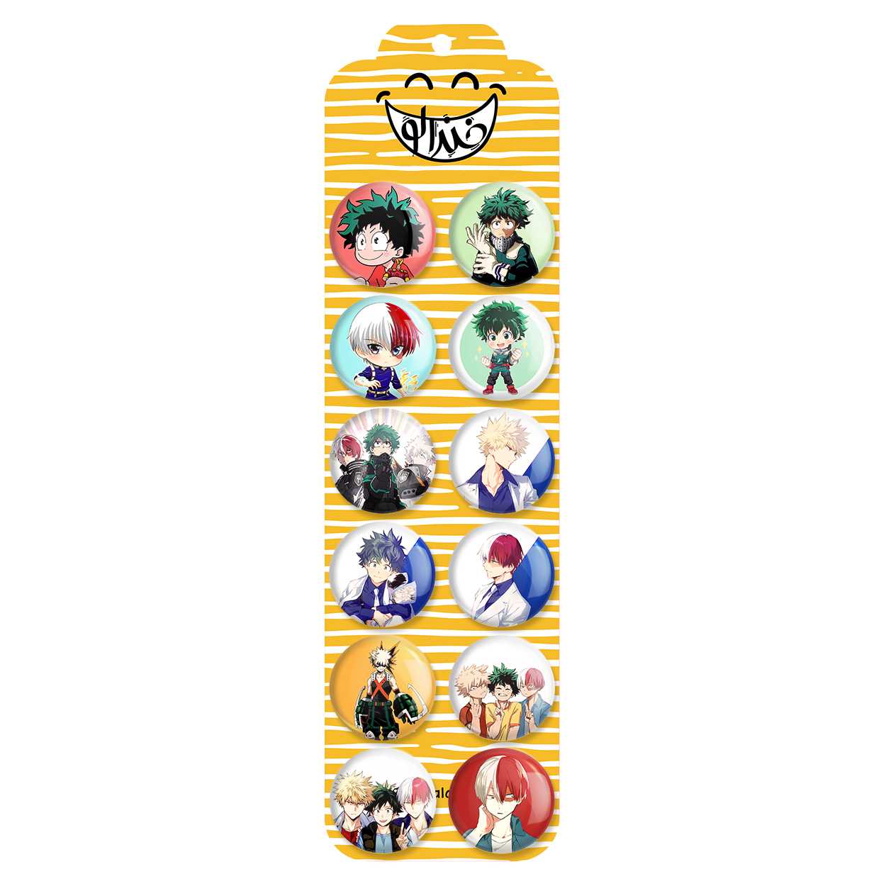 پک 12 عددی پیکسل خندالو طرح انیمه آکادمی قهرمانان من با روکش سلفون حرارتی براق ضدخش و قطعه پشتی رنگی تولید شده است. قطعات پشتی از میان 6 رنگ سفید، مشکی، صورتی، زرد، آبی و قرمز که با توجه به نوع و رنگبندی طرح روی پیکسل انتخاب شده اند تولید می شود و در هر بسته بندی مطابق عکس محصول می باشد. قطعات پلاستیکی پشت پیکسل با سوزن یک تکه ثابت و بدون لغزش و جا به جایی، ایستایی بسیار بهتری نسبت به پشتی فلزی پیکسل دارند که این مهم در تولید این محصول نیز رعایت شده است.