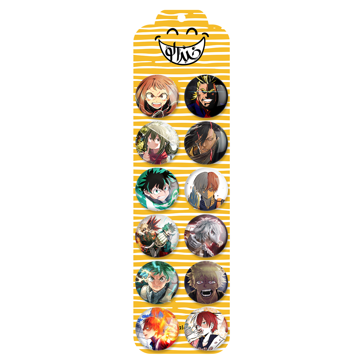 پک 12 عددی پیکسل خندالو طرح انیمه آکادمی قهرمانان من با روکش سلفون حرارتی براق ضدخش و قطعه پشتی رنگی تولید شده است. قطعات پشتی از میان 6 رنگ سفید، مشکی، صورتی، زرد، آبی و قرمز که با توجه به نوع و رنگبندی طرح روی پیکسل انتخاب شده اند تولید می شود و در هر بسته بندی مطابق عکس محصول می باشد. قطعات پلاستیکی پشت پیکسل با سوزن یک تکه ثابت و بدون لغزش و جا به جایی، ایستایی بسیار بهتری نسبت به پشتی فلزی پیکسل دارند که این مهم در تولید این محصول نیز رعایت شده است.
