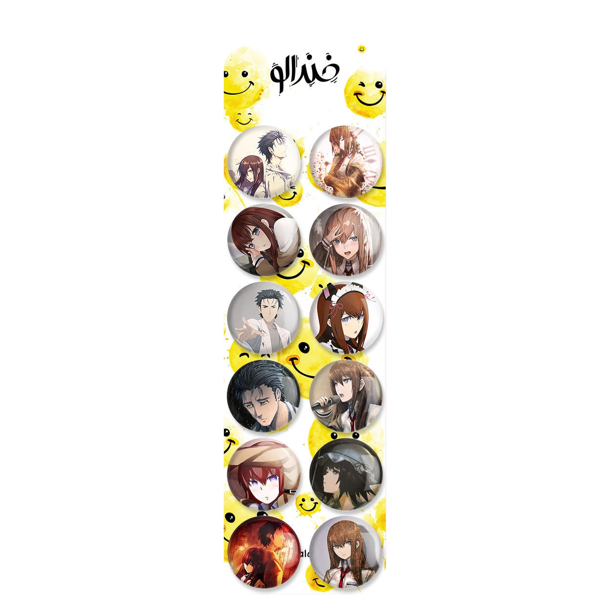 پک 12 عددی پیکسل خندالو طرح انیمه اشتاینز گیت (Steins Gate) با روکش سلفون حرارتی براق ضدخش و قطعه پشتی رنگی تولید شده است. قطعات پشتی از میان 6 رنگ سفید، مشکی، صورتی، زرد، آبی و قرمز که با توجه به نوع و رنگبندی طرح روی پیکسل انتخاب شده اند تولید می شود و در هر بسته بندی مطابق عکس محصول می باشد. قطعات پلاستیکی پشت پیکسل با سوزن یک تکه ثابت و بدون لغزش و جا به جایی، ایستایی بسیار بهتری نسبت به پشتی فلزی پیکسل دارند که این مهم در تولید این محصول نیز رعایت شده است.