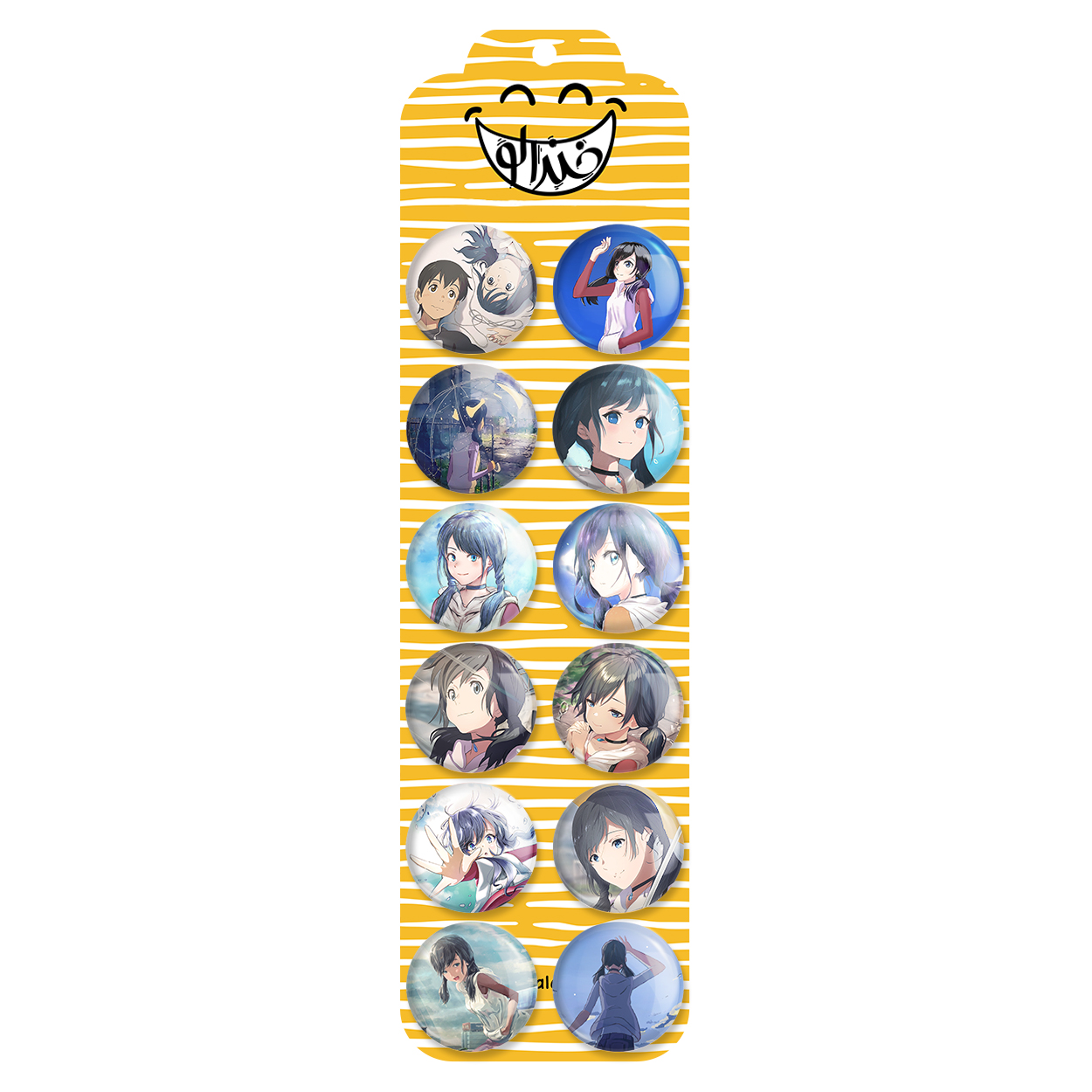 پک 12 عددی پیکسل خندالو طرح انیمه تغییر آب و هوا با تو با روکش سلفون حرارتی براق ضدخش و قطعه پشتی رنگی تولید شده است. قطعات پشتی از میان 6 رنگ سفید، مشکی، صورتی، زرد، آبی و قرمز که با توجه به نوع و رنگبندی طرح روی پیکسل انتخاب شده اند تولید می شود و در هر بسته بندی مطابق عکس محصول می باشد. قطعات پلاستیکی پشت پیکسل با سوزن یک تکه ثابت و بدون لغزش و جا به جایی، ایستایی بسیار بهتری نسبت به پشتی فلزی پیکسل دارند که این مهم در تولید این محصول نیز رعایت شده است.