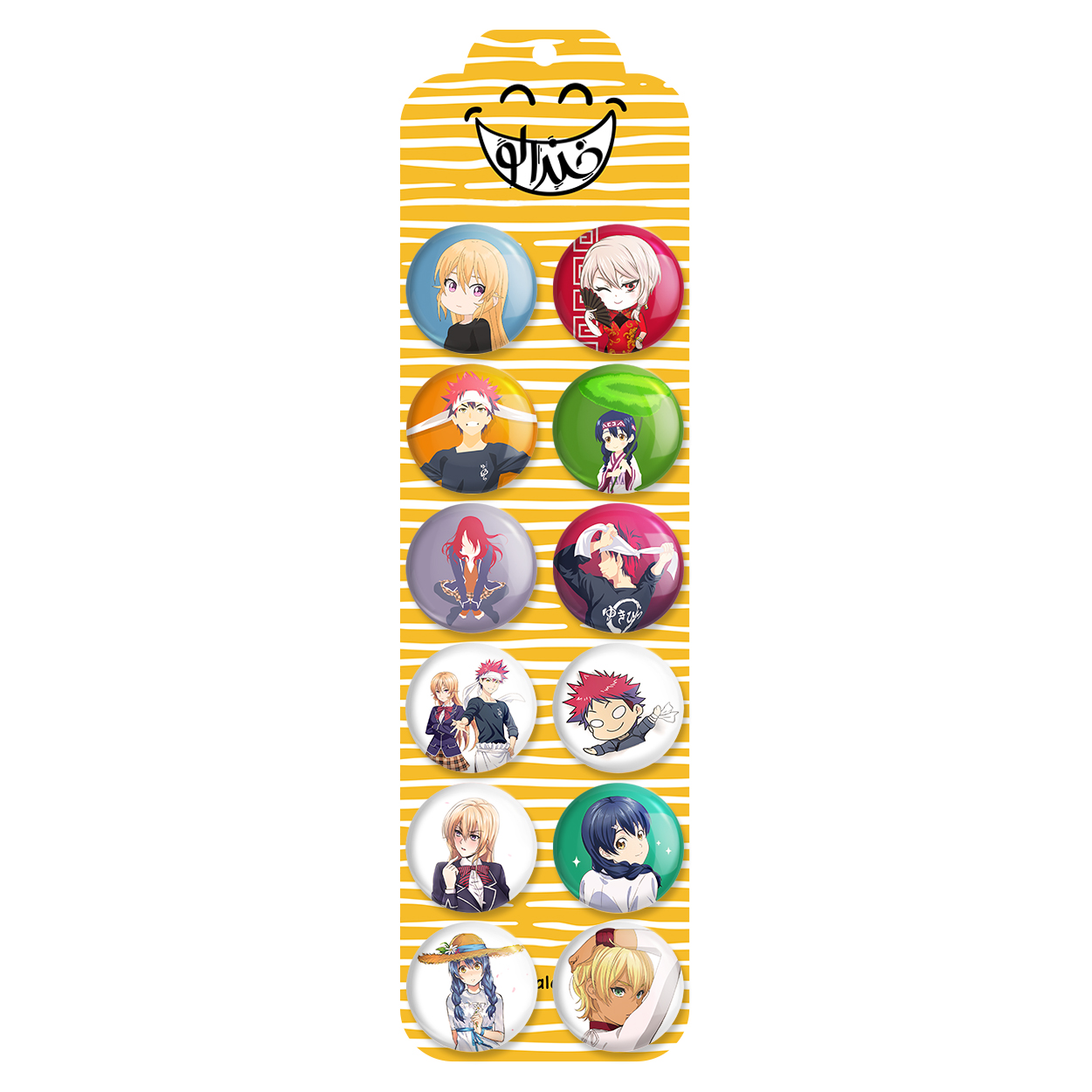 پک 12 عددی پیکسل خندالو طرح انیمه جنگ غذاها (Food Wars) با روکش سلفون حرارتی براق ضدخش و قطعه پشتی رنگی تولید شده است. قطعات پشتی از میان 6 رنگ سفید، مشکی، صورتی، زرد، آبی و قرمز که با توجه به نوع و رنگبندی طرح روی پیکسل انتخاب شده اند تولید می شود و در هر بسته بندی مطابق عکس محصول می باشد. قطعات پلاستیکی پشت پیکسل با سوزن یک تکه ثابت و بدون لغزش و جا به جایی، ایستایی بسیار بهتری نسبت به پشتی فلزی پیکسل دارند که این مهم در تولید این محصول نیز رعایت شده است.