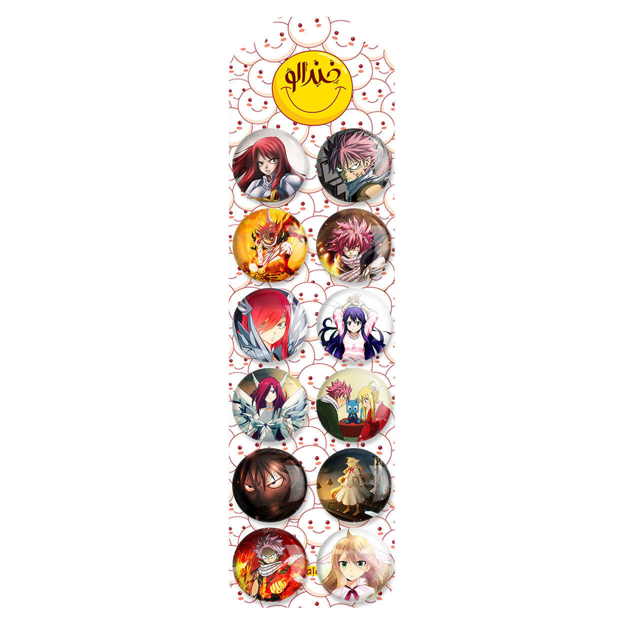 پک 12 عددی پیکسل خندالو طرح انیمه فری تیل (Fairy Tail) با روکش سلفون حرارتی براق ضدخش و قطعه پشتی رنگی تولید شده است. قطعات پشتی از میان 6 رنگ سفید، مشکی، صورتی، زرد، آبی و قرمز که با توجه به نوع و رنگبندی طرح روی پیکسل انتخاب شده اند تولید می شود و در هر بسته بندی مطابق عکس محصول می باشد. قطعات پلاستیکی پشت پیکسل با سوزن یک تکه ثابت و بدون لغزش و جا به جایی، ایستایی بسیار بهتری نسبت به پشتی فلزی پیکسل دارند که این مهم در تولید این محصول نیز رعایت شده است. چاپ پیکسل طرح انیمه فری تیل (Fairy Tail) بسته ۱۲ عددی نیز با دستگاه های استاندارد و با بهترین سطح کیفی صورت گرفته و طرح با شفافیتی مثال زدنی و با سلفونی بدون شکست نور بر روی پیکسل نقش بسته است.