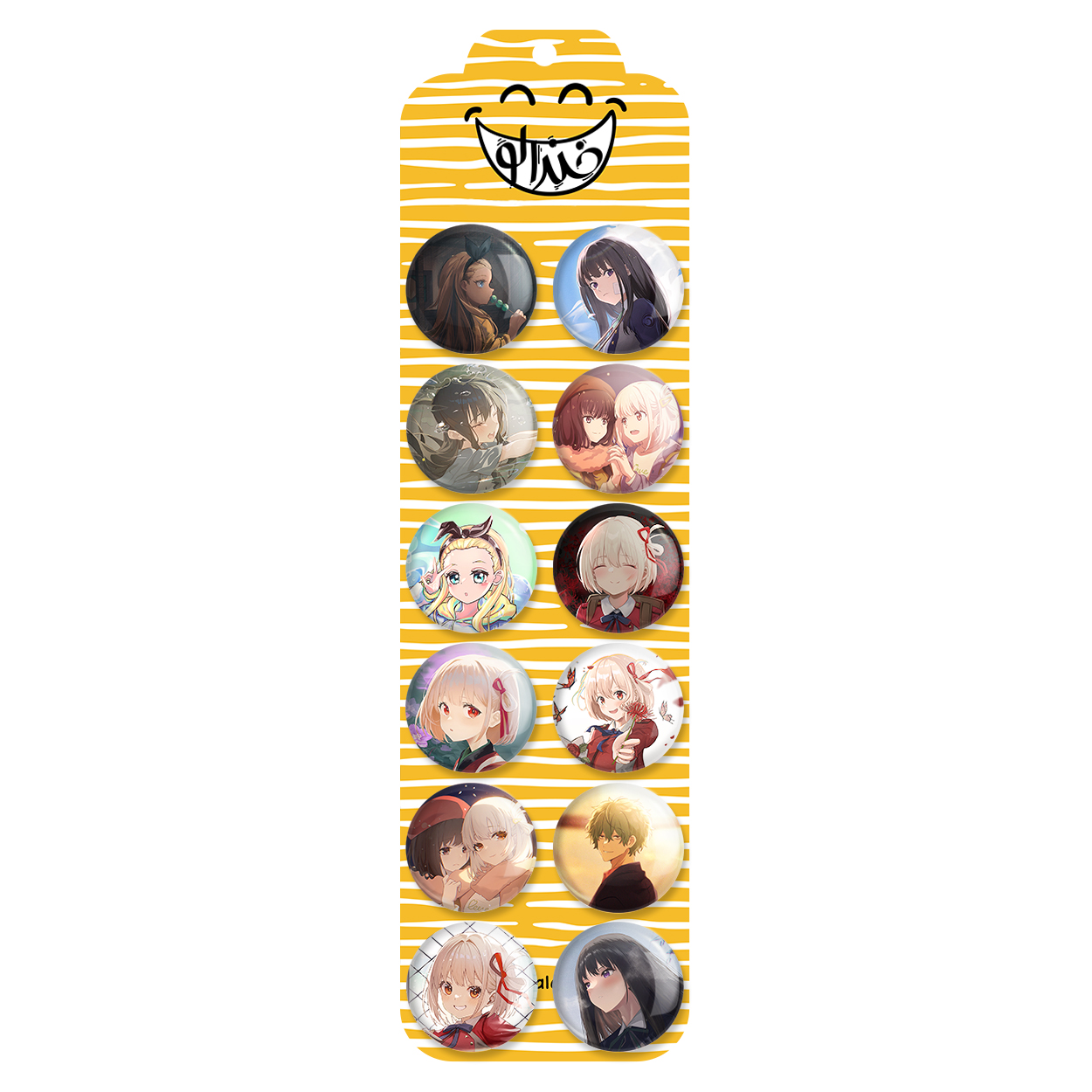 پک 12 عددی پیکسل خندالو طرح انیمه لیکوریس ریکویل با روکش سلفون حرارتی براق ضدخش و قطعه پشتی رنگی تولید شده است. قطعات پشتی از میان 6 رنگ سفید، مشکی، صورتی، زرد، آبی و قرمز که با توجه به نوع و رنگبندی طرح روی پیکسل انتخاب شده اند تولید می شود و در هر بسته بندی مطابق عکس محصول می باشد. قطعات پلاستیکی پشت پیکسل با سوزن یک تکه ثابت و بدون لغزش و جا به جایی، ایستایی بسیار بهتری نسبت به پشتی فلزی پیکسل دارند که این مهم در تولید این محصول نیز رعایت شده است.