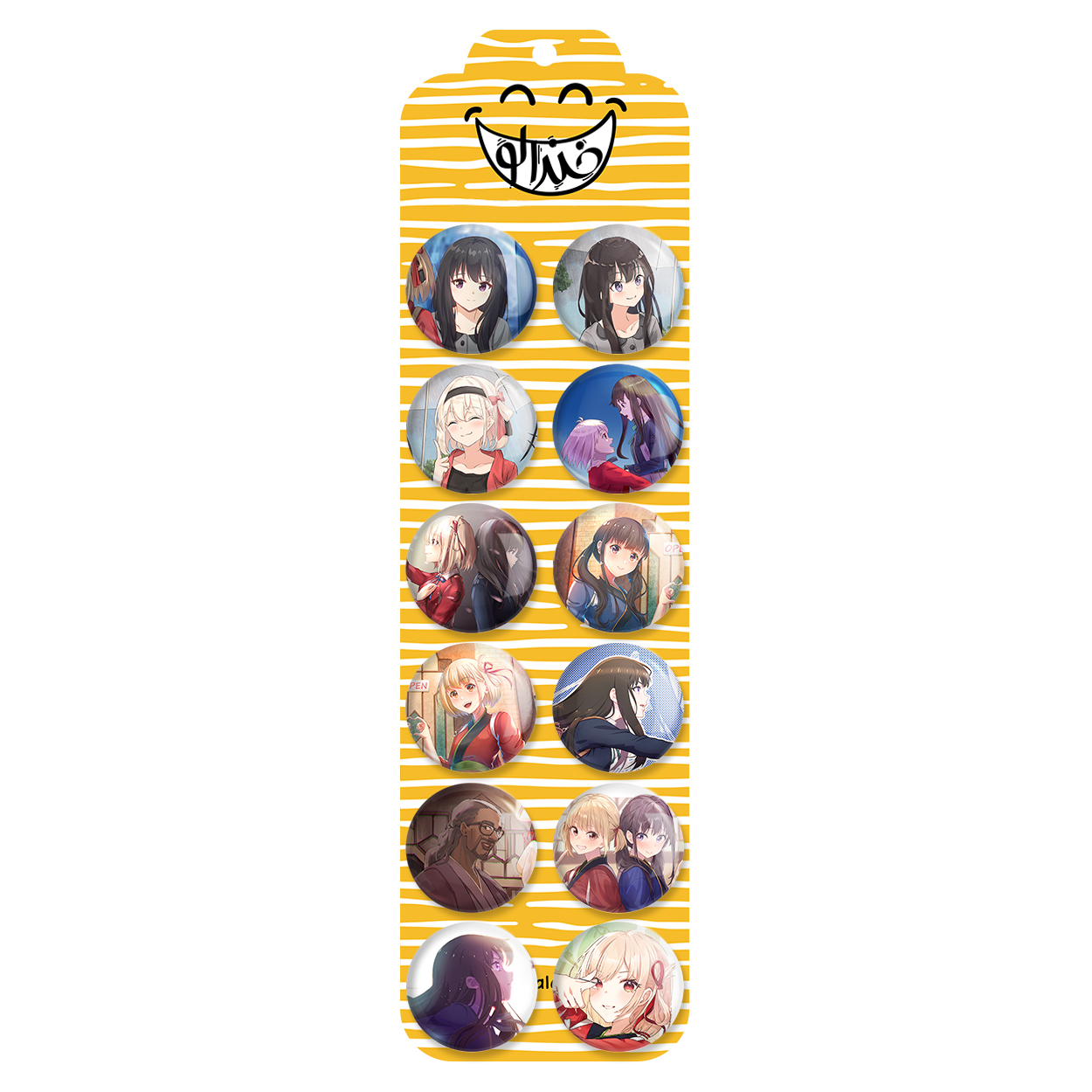 پک 12 عددی پیکسل خندالو طرح انیمه لیکوریس ریکویل با روکش سلفون حرارتی براق ضدخش و قطعه پشتی رنگی تولید شده است. قطعات پشتی از میان 6 رنگ سفید، مشکی، صورتی، زرد، آبی و قرمز که با توجه به نوع و رنگبندی طرح روی پیکسل انتخاب شده اند تولید می شود و در هر بسته بندی مطابق عکس محصول می باشد. قطعات پلاستیکی پشت پیکسل با سوزن یک تکه ثابت و بدون لغزش و جا به جایی، ایستایی بسیار بهتری نسبت به پشتی فلزی پیکسل دارند که این مهم در تولید این محصول نیز رعایت شده است.