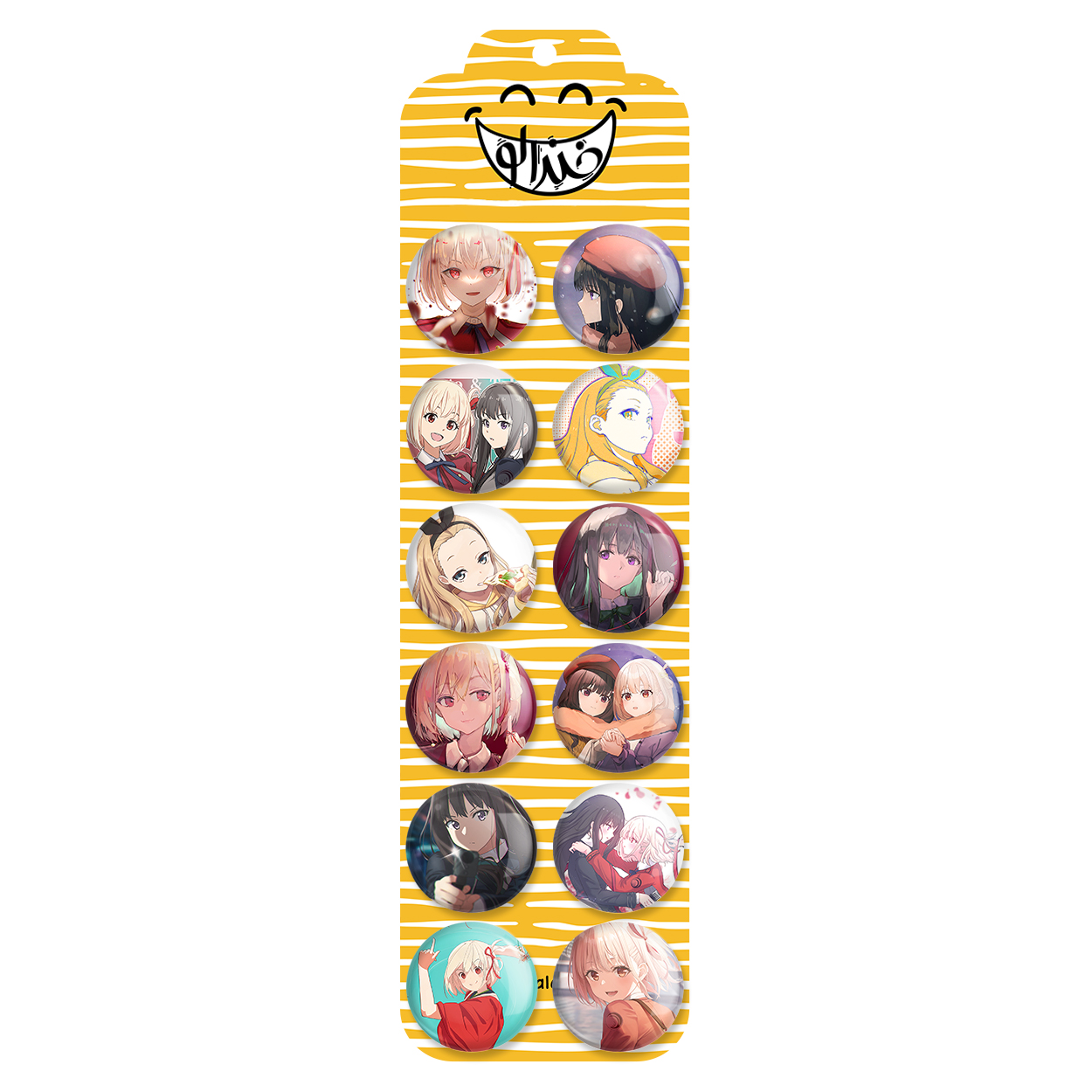 پک 12 عددی پیکسل خندالو طرح انیمه لیکوریس ریکویل با روکش سلفون حرارتی براق ضدخش و قطعه پشتی رنگی تولید شده است. قطعات پشتی از میان 6 رنگ سفید، مشکی، صورتی، زرد، آبی و قرمز که با توجه به نوع و رنگبندی طرح روی پیکسل انتخاب شده اند تولید می شود و در هر بسته بندی مطابق عکس محصول می باشد. قطعات پلاستیکی پشت پیکسل با سوزن یک تکه ثابت و بدون لغزش و جا به جایی، ایستایی بسیار بهتری نسبت به پشتی فلزی پیکسل دارند که این مهم در تولید این محصول نیز رعایت شده است.