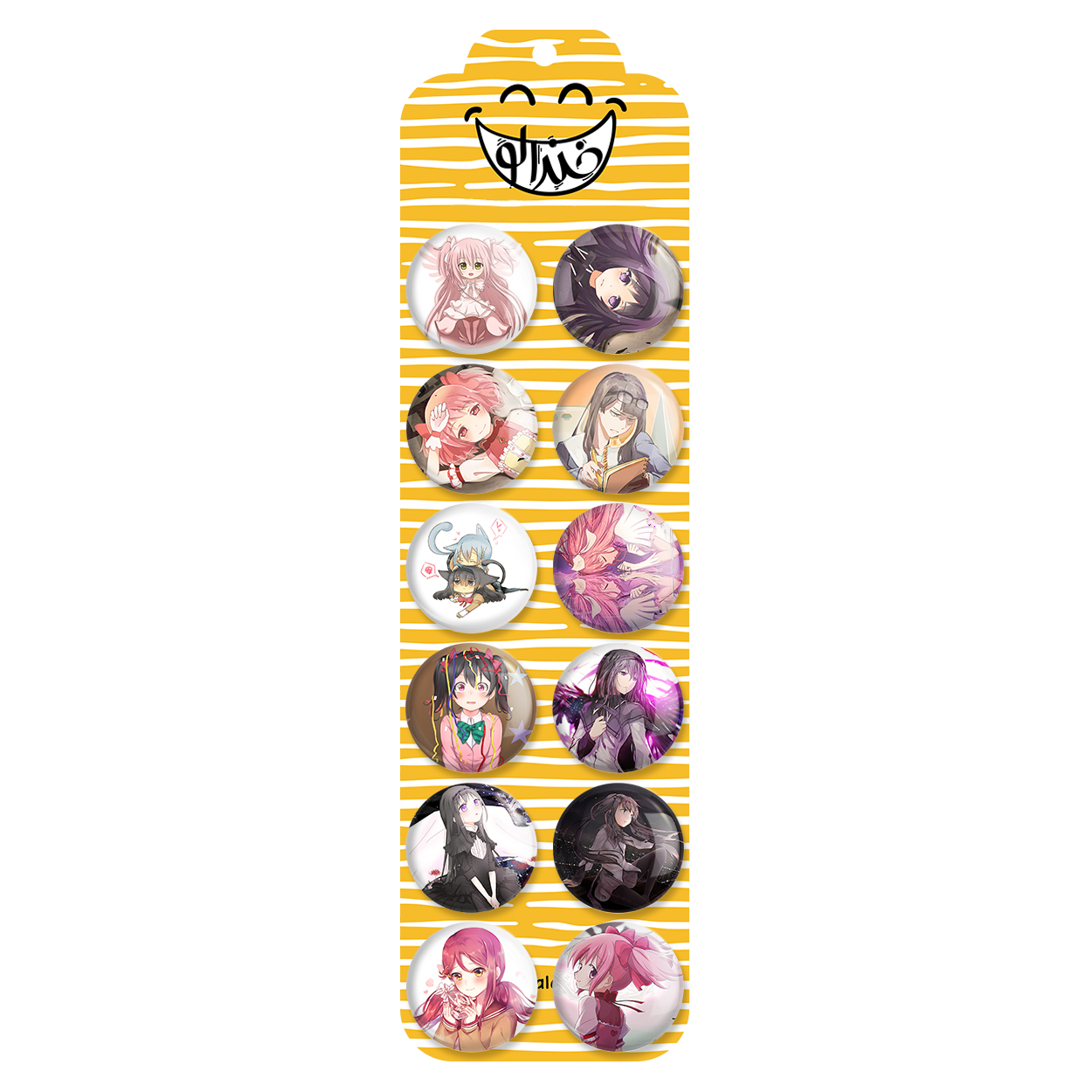 پک 12 عددی پیکسل خندالو طرح انیمه مادوکا مجیکا (Madoka Magica) با روکش سلفون حرارتی براق ضدخش و قطعه پشتی رنگی تولید شده است. قطعات پشتی از میان 6 رنگ سفید، مشکی، صورتی، زرد، آبی و قرمز که با توجه به نوع و رنگبندی طرح روی پیکسل انتخاب شده اند تولید می شود و در هر بسته بندی مطابق عکس محصول می باشد. قطعات پلاستیکی پشت پیکسل با سوزن یک تکه ثابت و بدون لغزش و جا به جایی، ایستایی بسیار بهتری نسبت به پشتی فلزی پیکسل دارند که این مهم در تولید این محصول نیز رعایت شده است.