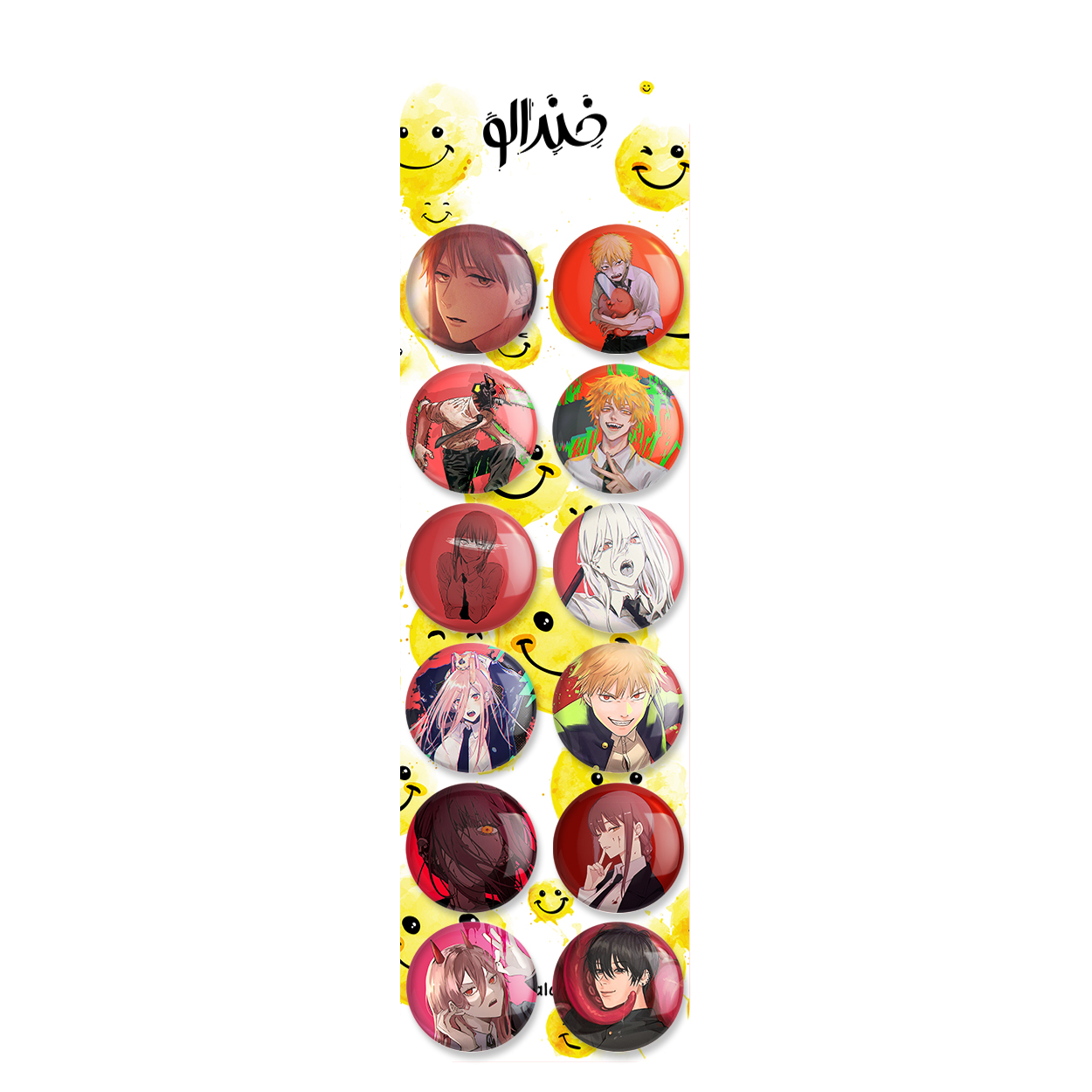 پک 12 عددی پیکسل خندالو طرح انیمه مرد اره ای (Chainsaw Man) با روکش سلفون حرارتی براق ضدخش و قطعه پشتی رنگی تولید شده است. قطعات پشتی از میان 6 رنگ سفید، مشکی، صورتی، زرد، آبی و قرمز که با توجه به نوع و رنگبندی طرح روی پیکسل انتخاب شده اند تولید می شود و در هر بسته بندی مطابق عکس محصول می باشد. قطعات پلاستیکی پشت پیکسل با سوزن یک تکه ثابت و بدون لغزش و جا به جایی، ایستایی بسیار بهتری نسبت به پشتی فلزی پیکسل دارند که این مهم در تولید این محصول نیز رعایت شده است.
