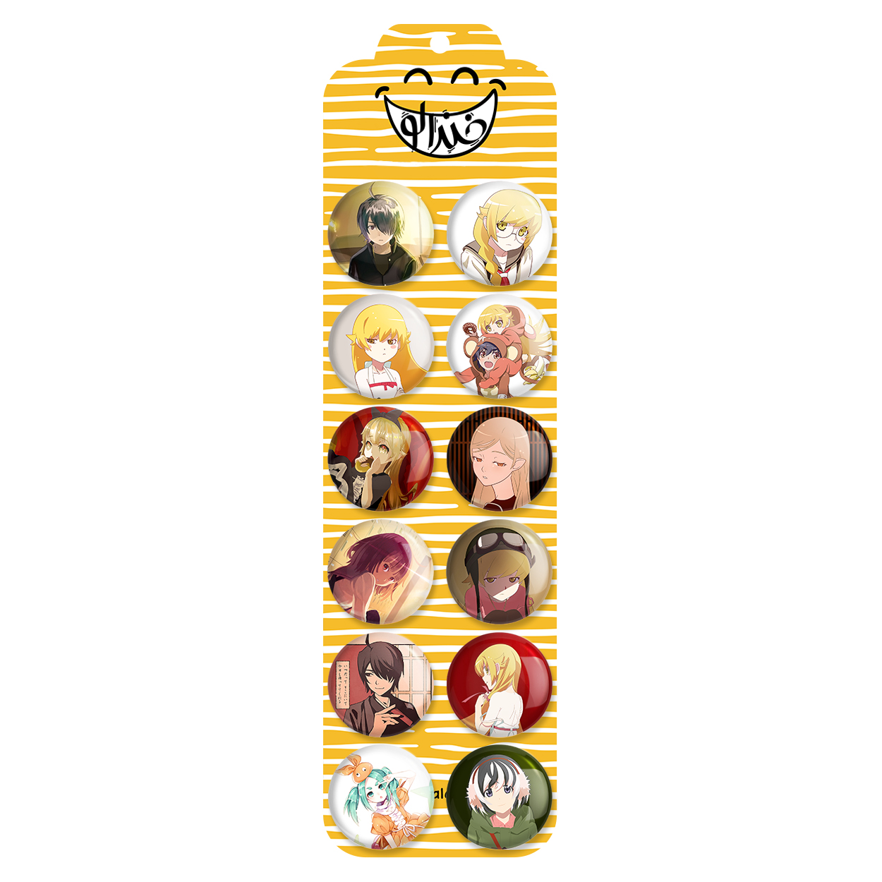 پک 12 عددی پیکسل خندالو طرح انیمه مونوگاتاری (Monogatar) با روکش سلفون حرارتی براق ضدخش و قطعه پشتی رنگی تولید شده است. قطعات پشتی از میان 6 رنگ سفید، مشکی، صورتی، زرد، آبی و قرمز که با توجه به نوع و رنگبندی طرح روی پیکسل انتخاب شده اند تولید می شود و در هر بسته بندی مطابق عکس محصول می باشد. قطعات پلاستیکی پشت پیکسل با سوزن یک تکه ثابت و بدون لغزش و جا به جایی، ایستایی بسیار بهتری نسبت به پشتی فلزی پیکسل دارند که این مهم در تولید این محصول نیز رعایت شده است.
