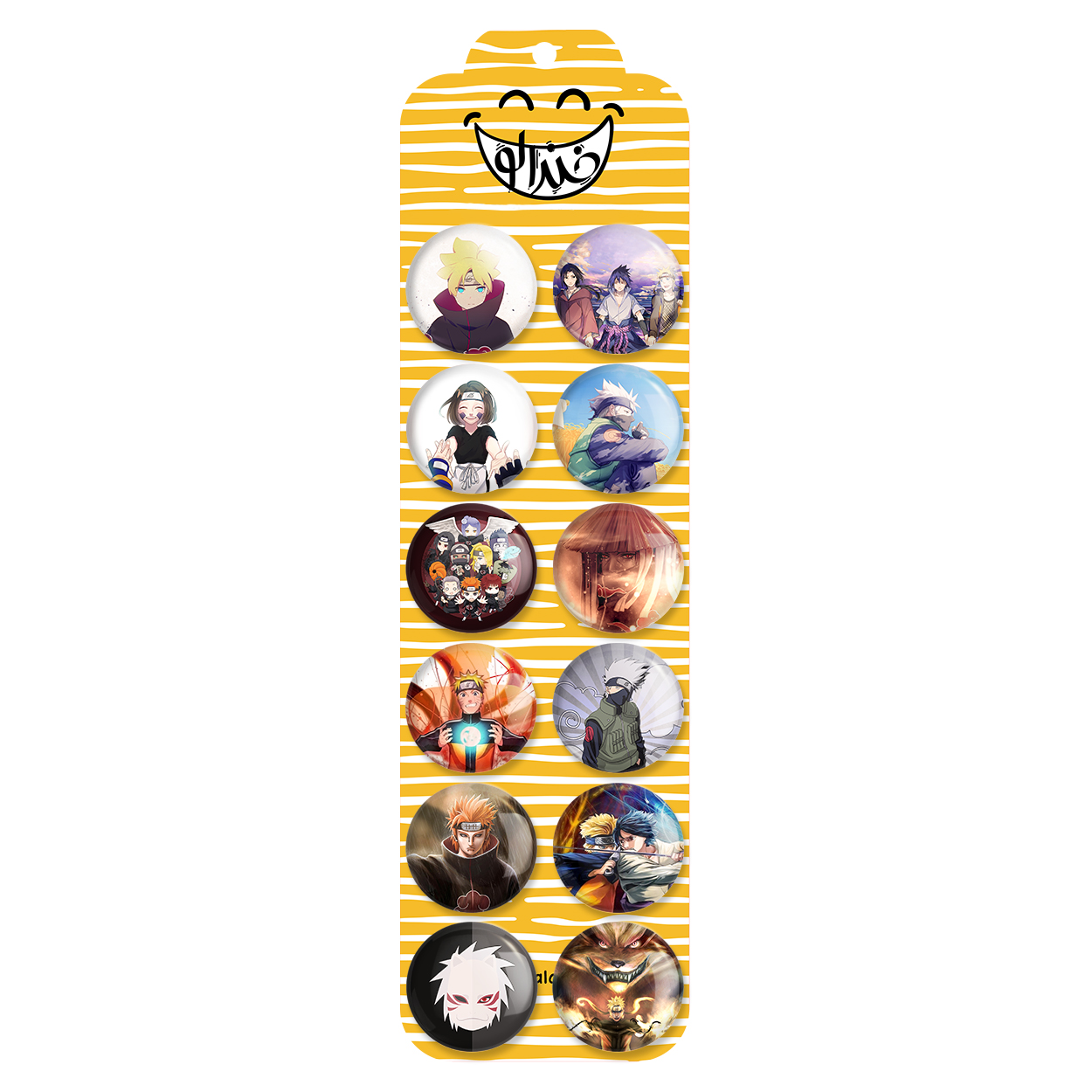 پک 12 عددی پیکسل خندالو طرح انیمه ناروتو (Naruto) با روکش سلفون حرارتی براق ضدخش و قطعه پشتی رنگی تولید شده است. قطعات پشتی از میان 6 رنگ سفید، مشکی، صورتی، زرد، آبی و قرمز که با توجه به نوع و رنگبندی طرح روی پیکسل انتخاب شده اند تولید می شود و در هر بسته بندی مطابق عکس محصول می باشد. قطعات پلاستیکی پشت پیکسل با سوزن یک تکه ثابت و بدون لغزش و جا به جایی، ایستایی بسیار بهتری نسبت به پشتی فلزی پیکسل دارند که این مهم در تولید این محصول نیز رعایت شده است.