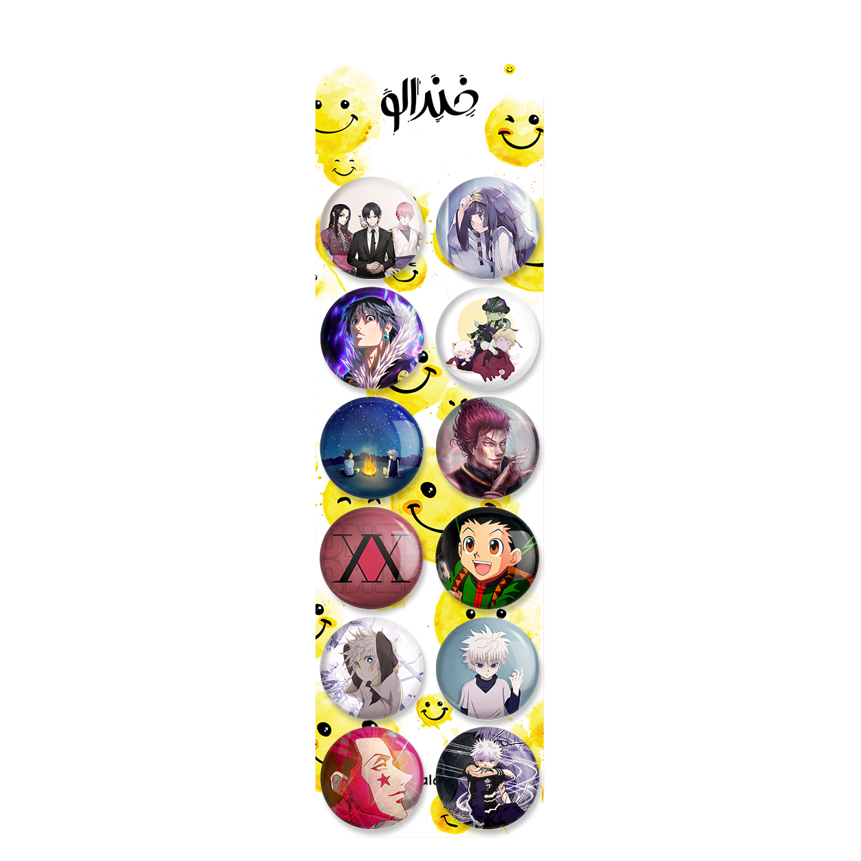 پک 12 عددی پیکسل خندالو طرح انیمه هانترایکس هانتر (Hunter × Hunter) با روکش سلفون حرارتی براق ضدخش و قطعه پشتی رنگی تولید شده است. قطعات پشتی از میان 6 رنگ سفید، مشکی، صورتی، زرد، آبی و قرمز که با توجه به نوع و رنگبندی طرح روی پیکسل انتخاب شده اند تولید می شود و در هر بسته بندی مطابق عکس محصول می باشد. قطعات پلاستیکی پشت پیکسل با سوزن یک تکه ثابت و بدون لغزش و جا به جایی، ایستایی بسیار بهتری نسبت به پشتی فلزی پیکسل دارند که این مهم در تولید این محصول نیز رعایت شده است.