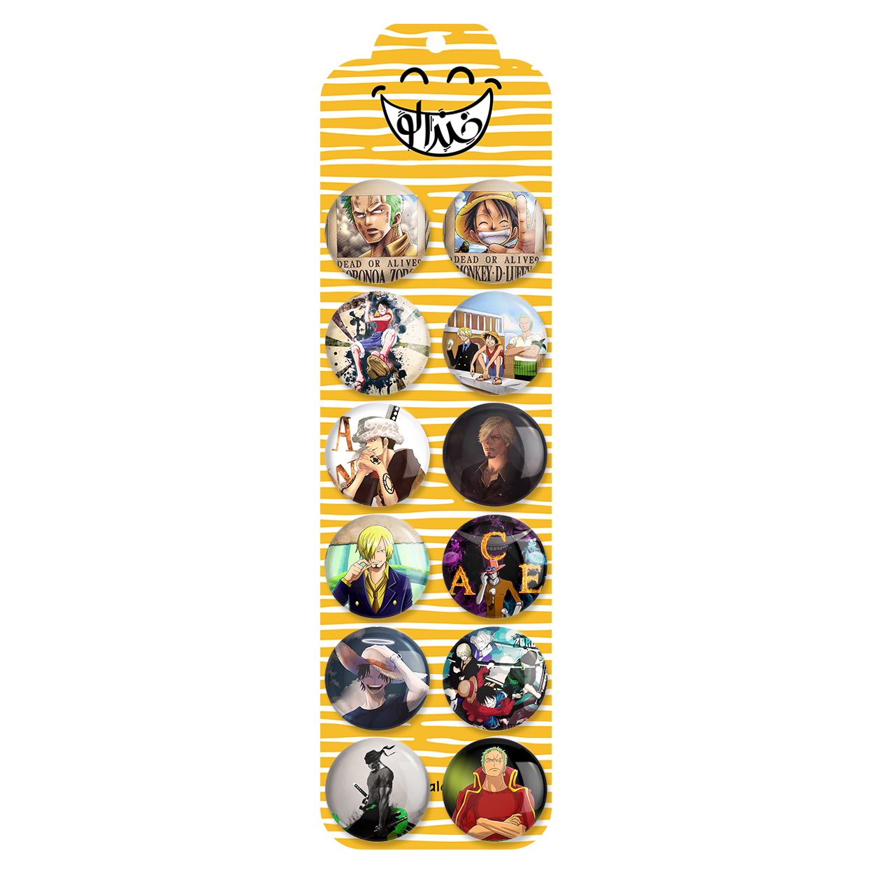 پک 12 عددی پیکسل خندالو طرح انیمه وان پیس (One Piece) با روکش سلفون حرارتی براق ضدخش و قطعه پشتی رنگی تولید شده است. قطعات پشتی از میان 6 رنگ سفید، مشکی، صورتی، زرد، آبی و قرمز که با توجه به نوع و رنگبندی طرح روی پیکسل انتخاب شده اند تولید می شود و در هر بسته بندی مطابق عکس محصول می باشد. قطعات پلاستیکی پشت پیکسل با سوزن یک تکه ثابت و بدون لغزش و جا به جایی، ایستایی بسیار بهتری نسبت به پشتی فلزی پیکسل دارند که این مهم در تولید این محصول نیز رعایت شده است.