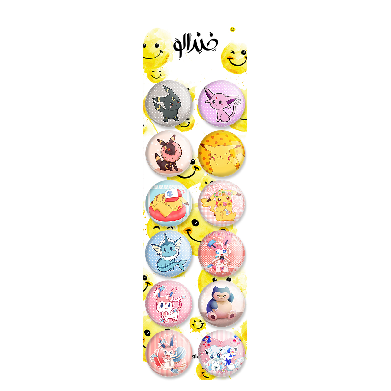 پک 12 عددی پیکسل خندالو طرح انیمه پوکمون (Pokemon) با روکش سلفون حرارتی براق ضدخش و قطعه پشتی رنگی تولید شده است. قطعات پشتی از میان 6 رنگ سفید، مشکی، صورتی، زرد، آبی و قرمز که با توجه به نوع و رنگبندی طرح روی پیکسل انتخاب شده اند تولید می شود و در هر بسته بندی مطابق عکس محصول می باشد. قطعات پلاستیکی پشت پیکسل با سوزن یک تکه ثابت و بدون لغزش و جا به جایی، ایستایی بسیار بهتری نسبت به پشتی فلزی پیکسل دارند که این مهم در تولید این محصول نیز رعایت شده است.