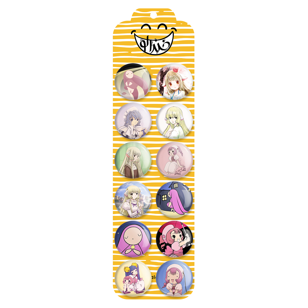 پک 12 عددی پیکسل خندالو طرح انیمه چوبیتس (Chobits) با روکش سلفون حرارتی براق ضدخش و قطعه پشتی رنگی تولید شده است. قطعات پشتی از میان 6 رنگ سفید، مشکی، صورتی، زرد، آبی و قرمز که با توجه به نوع و رنگبندی طرح روی پیکسل انتخاب شده اند تولید می شود و در هر بسته بندی مطابق عکس محصول می باشد. قطعات پلاستیکی پشت پیکسل با سوزن یک تکه ثابت و بدون لغزش و جا به جایی، ایستایی بسیار بهتری نسبت به پشتی فلزی پیکسل دارند که این مهم در تولید این محصول نیز رعایت شده است. چاپ پیکسل طرح انیمه چوبیتس (Chobits) بسته ۱۲ عددی نیز با دستگاه های استاندارد و با بهترین سطح کیفی صورت گرفته و طرح با شفافیتی مثال زدنی و با سلفونی بدون شکست نور بر روی پیکسل نقش بسته است.